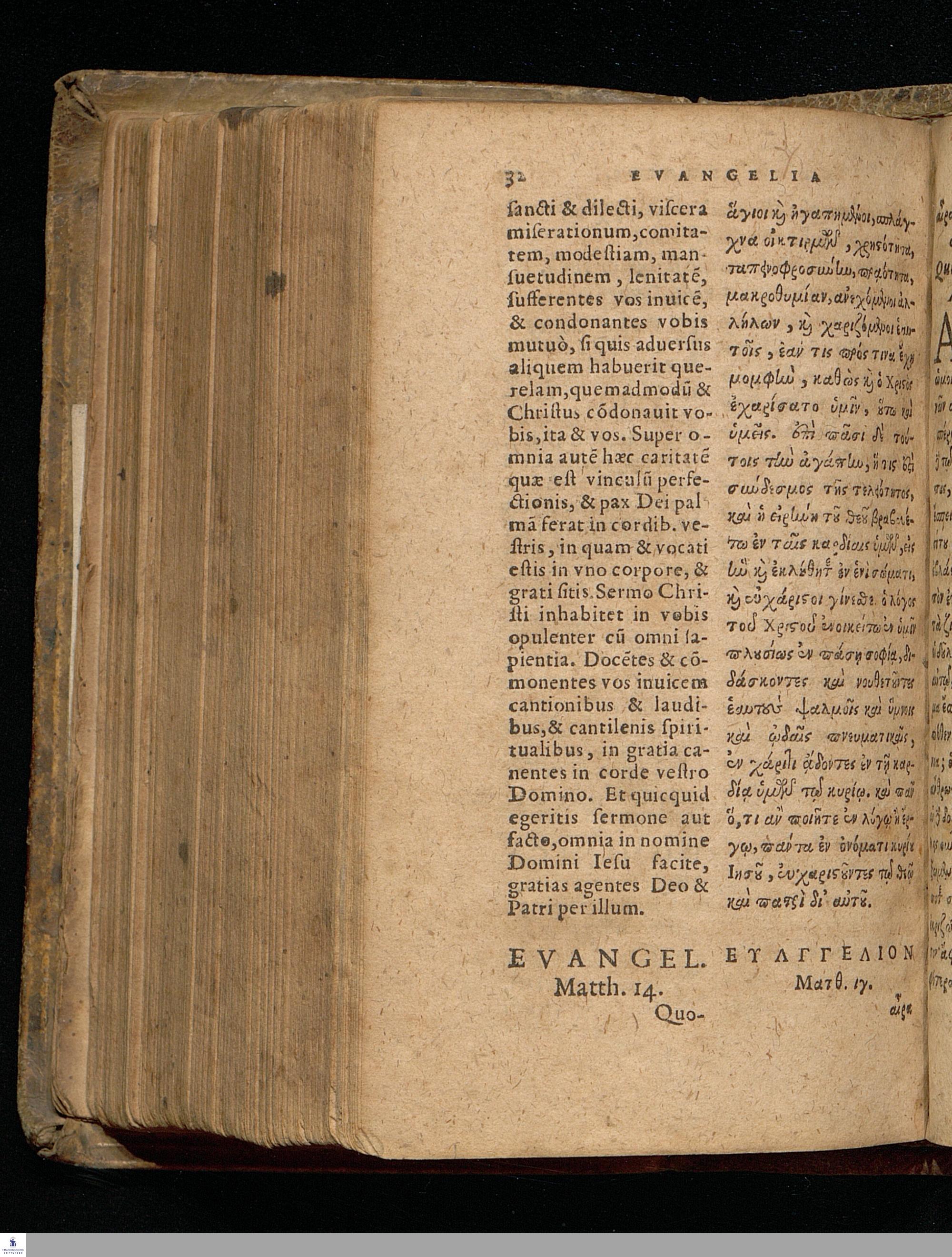 EUANGELIA TE || KAI EPISTOLAI TŌN KY-|| riakōn kaì heortastikōn hēmerōn hellenistì || kaì romaistì.||metà tōn distíchōn kyriakōn Christophórou Pelárgou hellenistì.|| EVANGELIA ET || EPISTOLAE DOMINI-||CORVM AC FESTORVM || dierum Græcè & Latinè.|| Vna cum distichis Dominicalibus Ioannis Stige-||lij, & festiualibus Bernhardi Bomgardij, correctius || quàm hactenus expressa.||