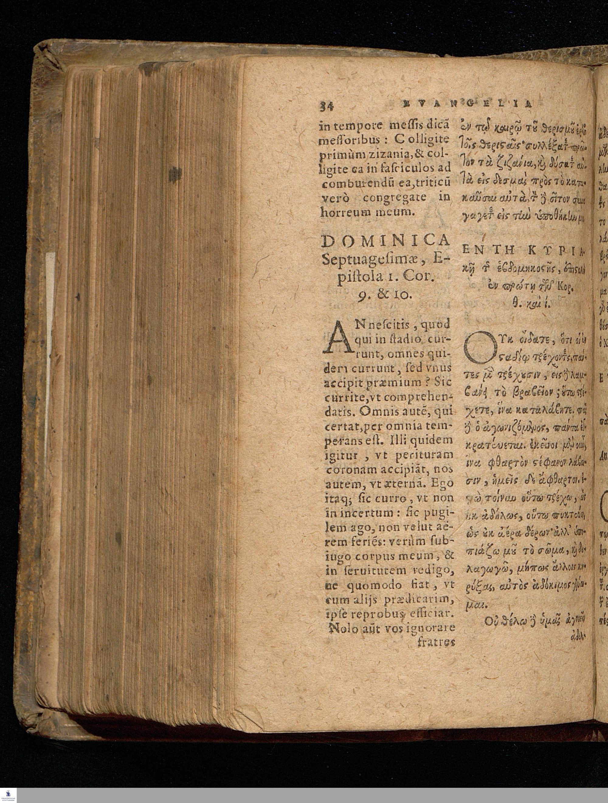 EUANGELIA TE || KAI EPISTOLAI TŌN KY-|| riakōn kaì heortastikōn hēmerōn hellenistì || kaì romaistì.||metà tōn distíchōn kyriakōn Christophórou Pelárgou hellenistì.|| EVANGELIA ET || EPISTOLAE DOMINI-||CORVM AC FESTORVM || dierum Græcè & Latinè.|| Vna cum distichis Dominicalibus Ioannis Stige-||lij, & festiualibus Bernhardi Bomgardij, correctius || quàm hactenus expressa.||