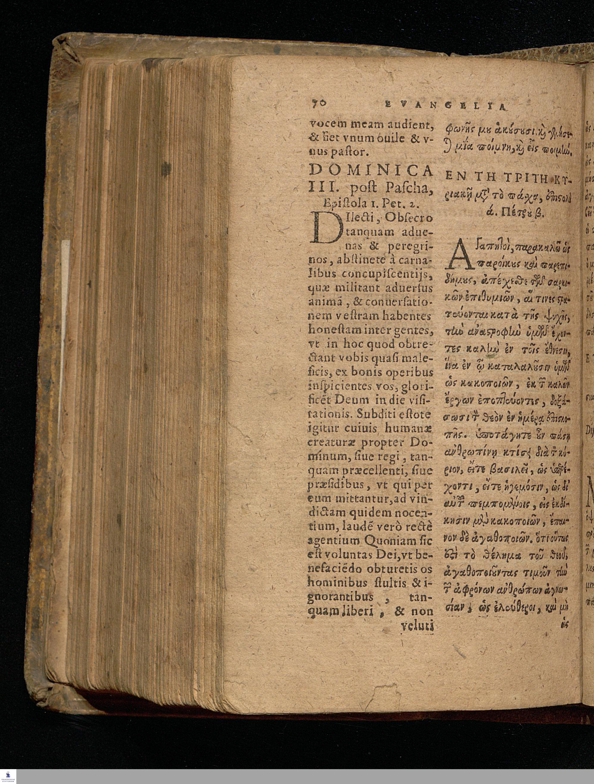 EUANGELIA TE || KAI EPISTOLAI TŌN KY-|| riakōn kaì heortastikōn hēmerōn hellenistì || kaì romaistì.||metà tōn distíchōn kyriakōn Christophórou Pelárgou hellenistì.|| EVANGELIA ET || EPISTOLAE DOMINI-||CORVM AC FESTORVM || dierum Græcè & Latinè.|| Vna cum distichis Dominicalibus Ioannis Stige-||lij, & festiualibus Bernhardi Bomgardij, correctius || quàm hactenus expressa.||