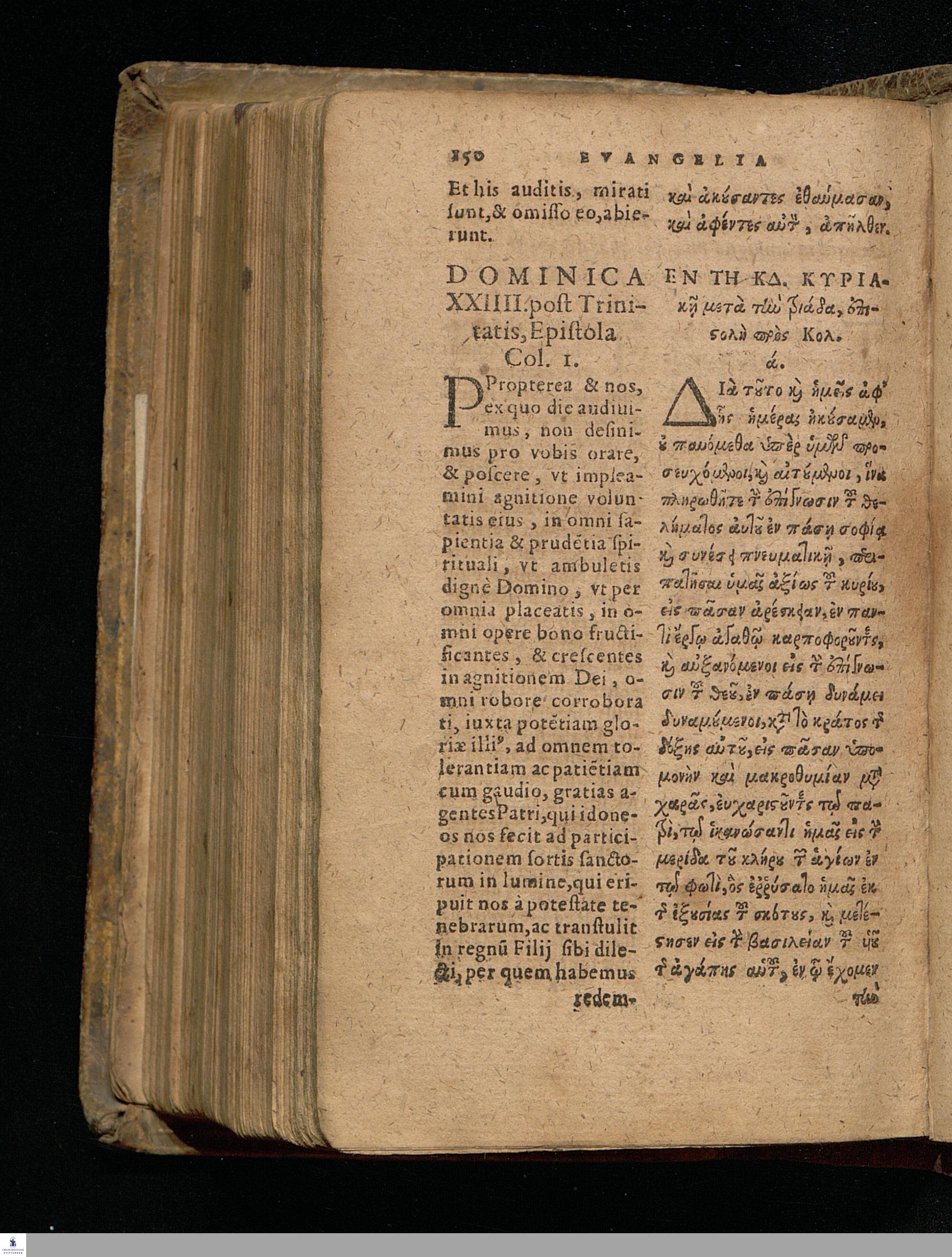 EUANGELIA TE || KAI EPISTOLAI TŌN KY-|| riakōn kaì heortastikōn hēmerōn hellenistì || kaì romaistì.||metà tōn distíchōn kyriakōn Christophórou Pelárgou hellenistì.|| EVANGELIA ET || EPISTOLAE DOMINI-||CORVM AC FESTORVM || dierum Græcè & Latinè.|| Vna cum distichis Dominicalibus Ioannis Stige-||lij, & festiualibus Bernhardi Bomgardij, correctius || quàm hactenus expressa.||