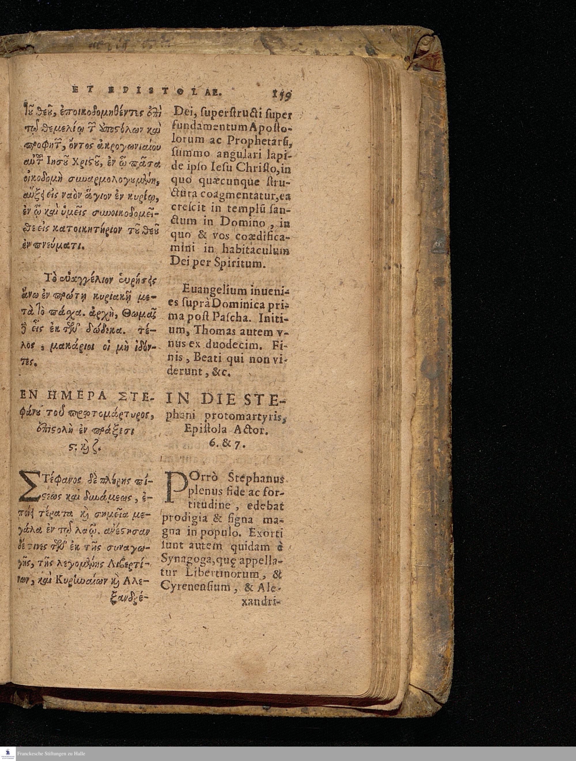 EUANGELIA TE || KAI EPISTOLAI TŌN KY-|| riakōn kaì heortastikōn hēmerōn hellenistì || kaì romaistì.||metà tōn distíchōn kyriakōn Christophórou Pelárgou hellenistì.|| EVANGELIA ET || EPISTOLAE DOMINI-||CORVM AC FESTORVM || dierum Græcè & Latinè.|| Vna cum distichis Dominicalibus Ioannis Stige-||lij, & festiualibus Bernhardi Bomgardij, correctius || quàm hactenus expressa.||