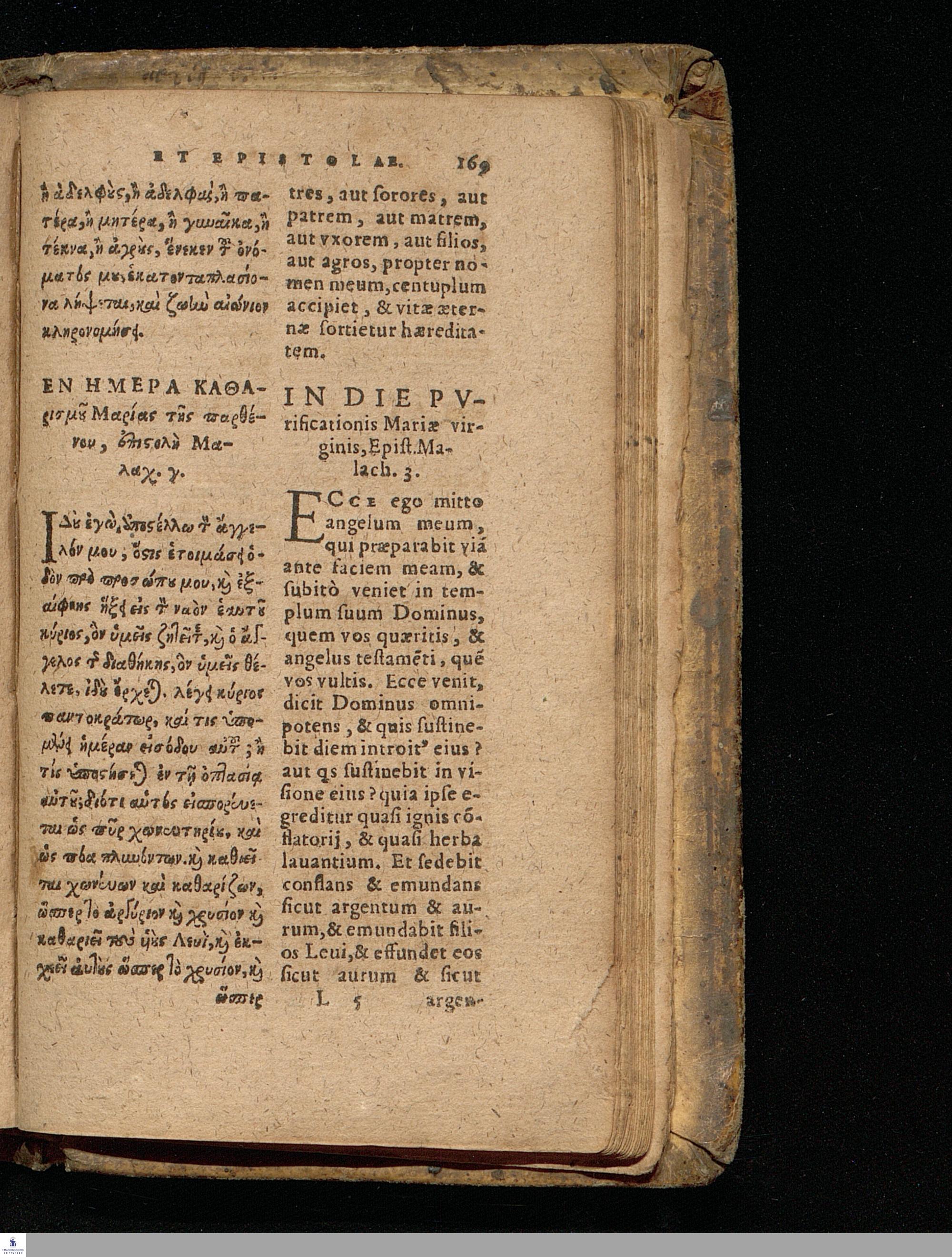 EUANGELIA TE || KAI EPISTOLAI TŌN KY-|| riakōn kaì heortastikōn hēmerōn hellenistì || kaì romaistì.||metà tōn distíchōn kyriakōn Christophórou Pelárgou hellenistì.|| EVANGELIA ET || EPISTOLAE DOMINI-||CORVM AC FESTORVM || dierum Græcè & Latinè.|| Vna cum distichis Dominicalibus Ioannis Stige-||lij, & festiualibus Bernhardi Bomgardij, correctius || quàm hactenus expressa.||