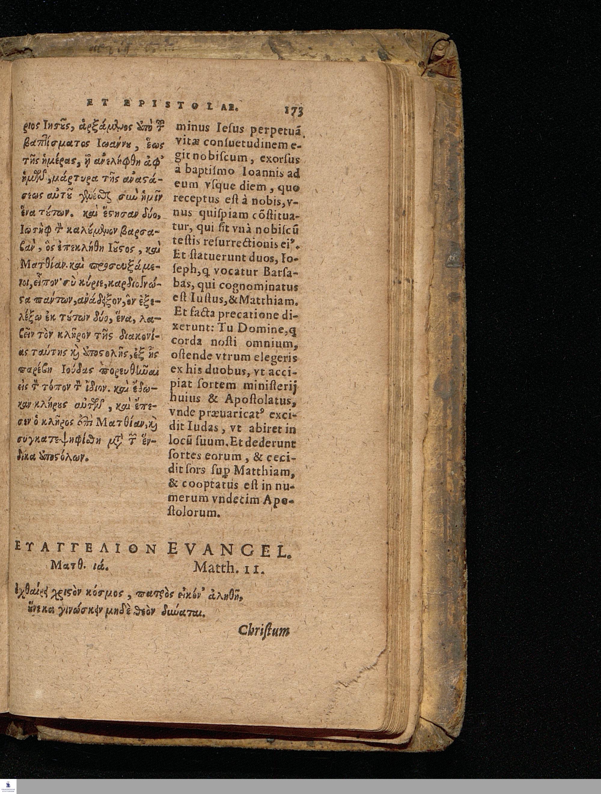 EUANGELIA TE || KAI EPISTOLAI TŌN KY-|| riakōn kaì heortastikōn hēmerōn hellenistì || kaì romaistì.||metà tōn distíchōn kyriakōn Christophórou Pelárgou hellenistì.|| EVANGELIA ET || EPISTOLAE DOMINI-||CORVM AC FESTORVM || dierum Græcè & Latinè.|| Vna cum distichis Dominicalibus Ioannis Stige-||lij, & festiualibus Bernhardi Bomgardij, correctius || quàm hactenus expressa.||