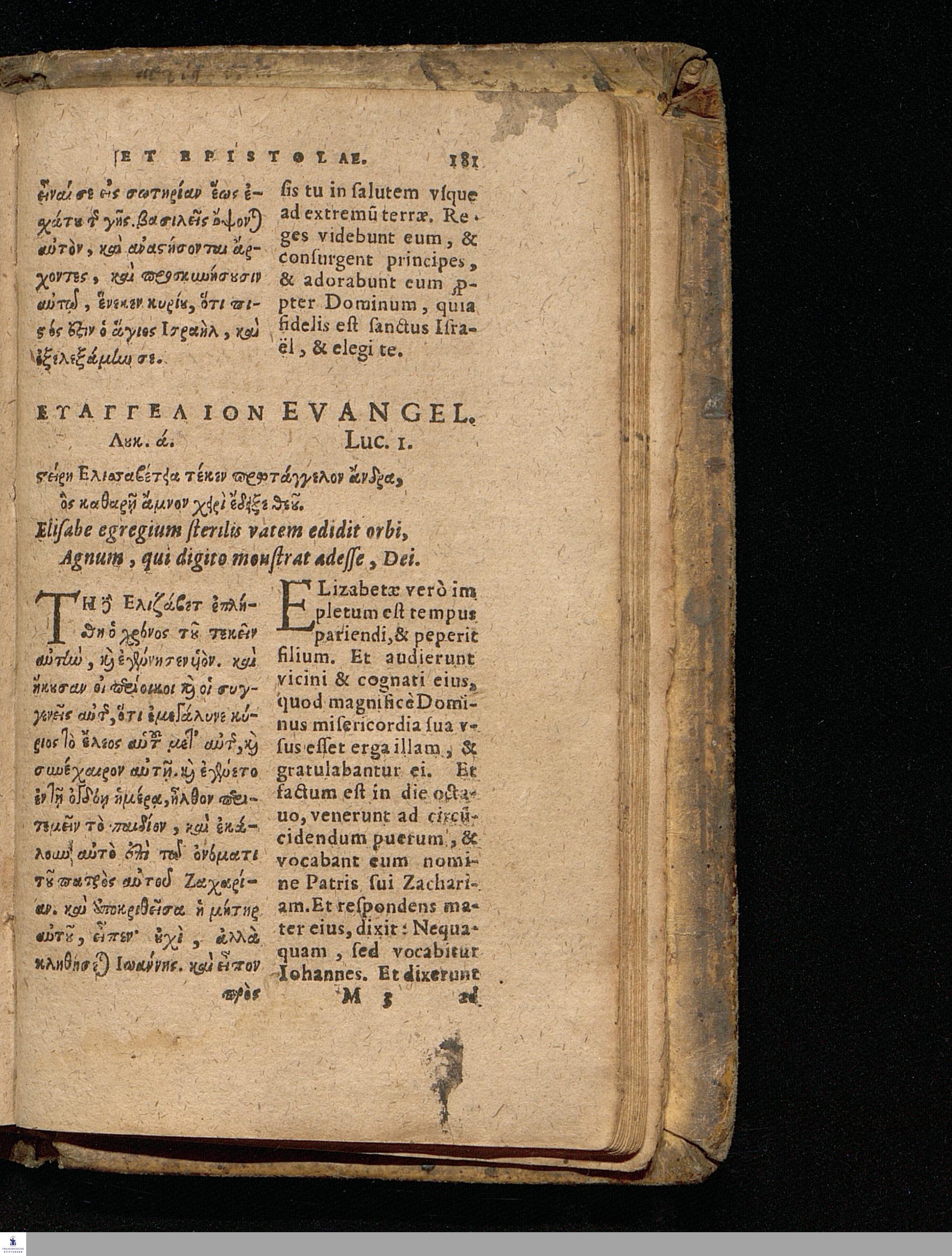 EUANGELIA TE || KAI EPISTOLAI TŌN KY-|| riakōn kaì heortastikōn hēmerōn hellenistì || kaì romaistì.||metà tōn distíchōn kyriakōn Christophórou Pelárgou hellenistì.|| EVANGELIA ET || EPISTOLAE DOMINI-||CORVM AC FESTORVM || dierum Græcè & Latinè.|| Vna cum distichis Dominicalibus Ioannis Stige-||lij, & festiualibus Bernhardi Bomgardij, correctius || quàm hactenus expressa.||