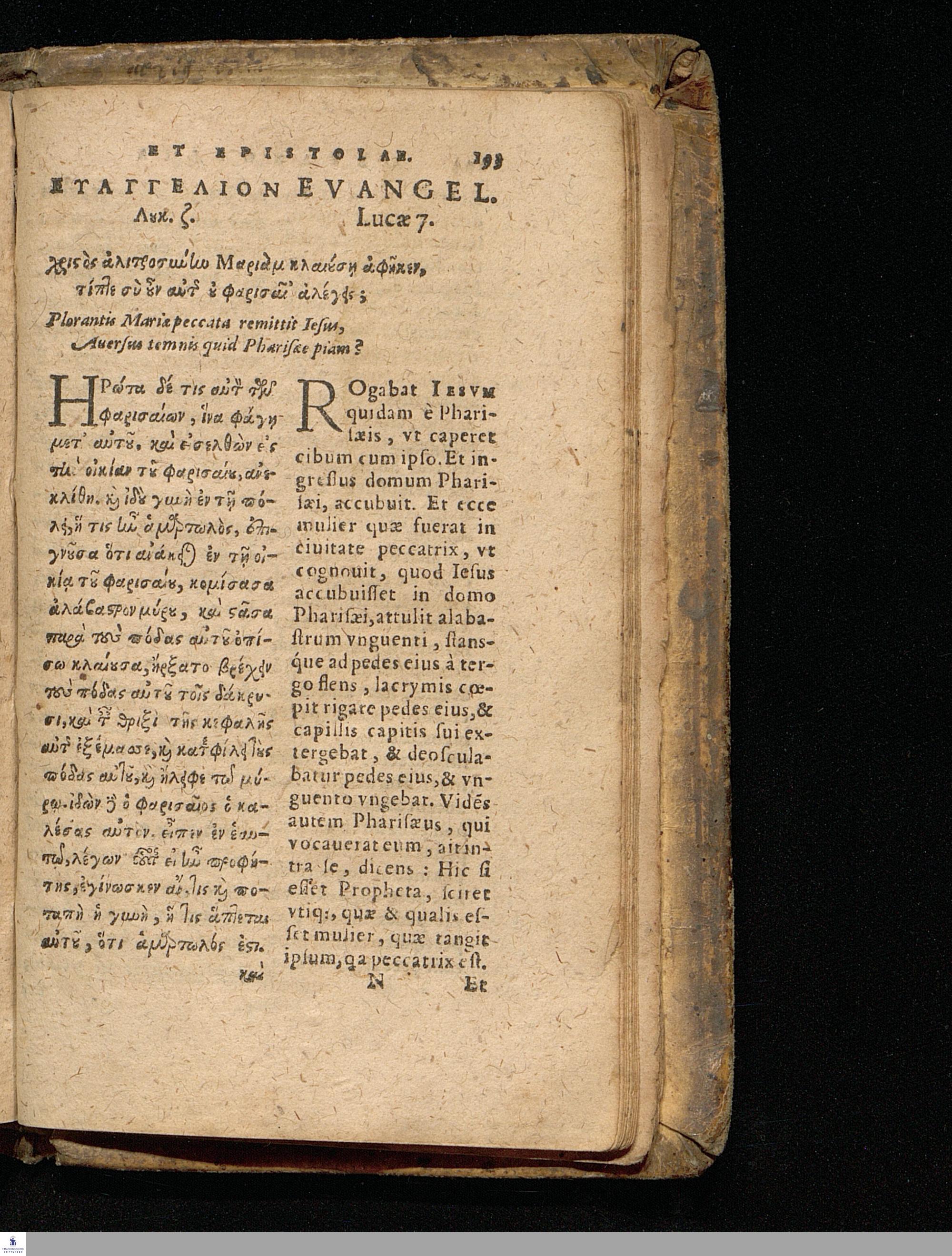 EUANGELIA TE || KAI EPISTOLAI TŌN KY-|| riakōn kaì heortastikōn hēmerōn hellenistì || kaì romaistì.||metà tōn distíchōn kyriakōn Christophórou Pelárgou hellenistì.|| EVANGELIA ET || EPISTOLAE DOMINI-||CORVM AC FESTORVM || dierum Græcè & Latinè.|| Vna cum distichis Dominicalibus Ioannis Stige-||lij, & festiualibus Bernhardi Bomgardij, correctius || quàm hactenus expressa.||