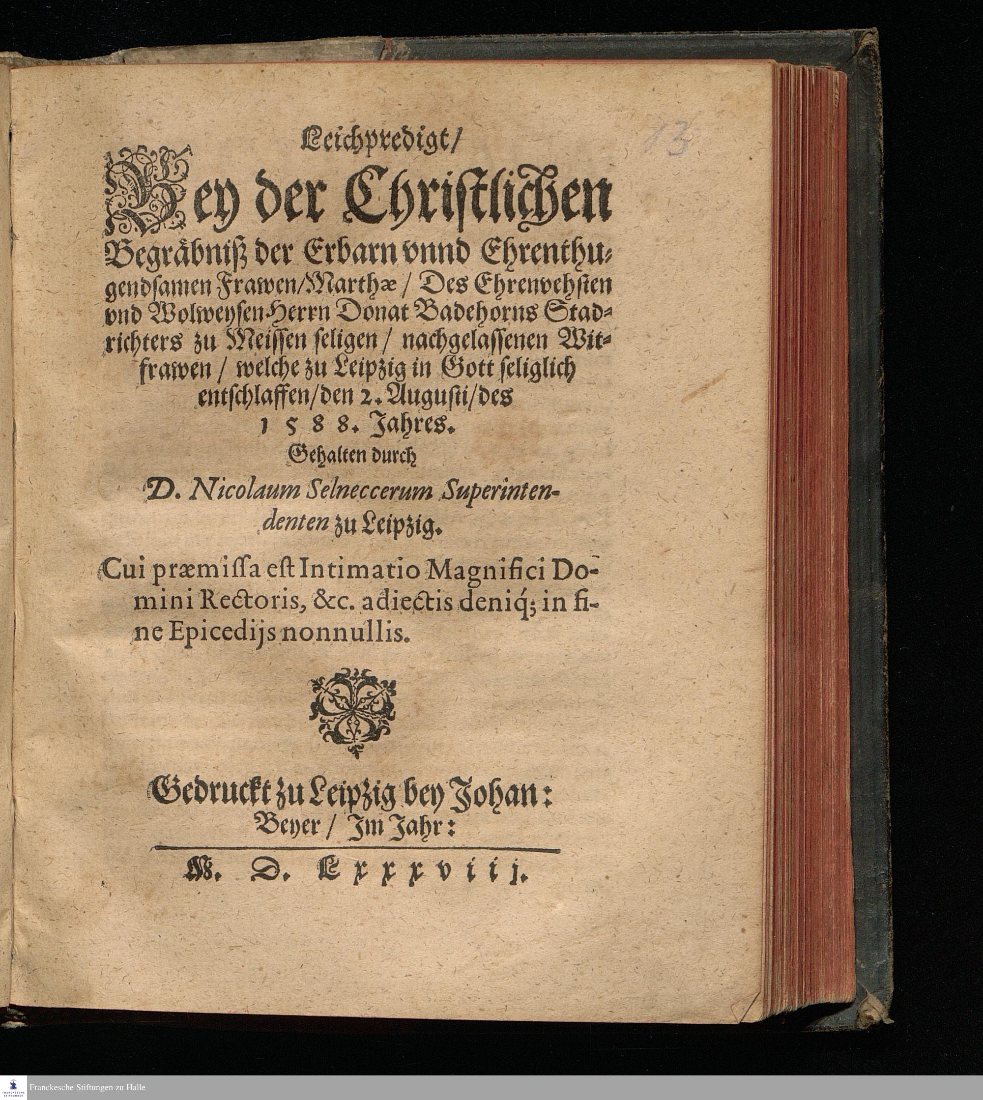 Leichpredigt/ || Bey der Christlichen || Begräbniß der Erbarn vnnd Ehrenthu=||gendsamen Frawen/ Marthae/ Des Ehrenvehsten || vnd Wolweysen Herrn Donat Badehorns Stad=||richters zu Meissen seligen/ nachgelassenen Wit=||frawen/ welche zu Leipzig in Gott seliglich || entschlaffen/ den 2. Augusti/ des || 1588. Jahres. || Gehalten durch || D. Nicolaum Selneccerum Superinten-||denten zu Leipzig. || Cui præmissa est Intimatio Magnifici Do-||mini Rectoris, &c. adiectis deniq[ue]; in fi-||ne Epicedijs nonnullis. ||