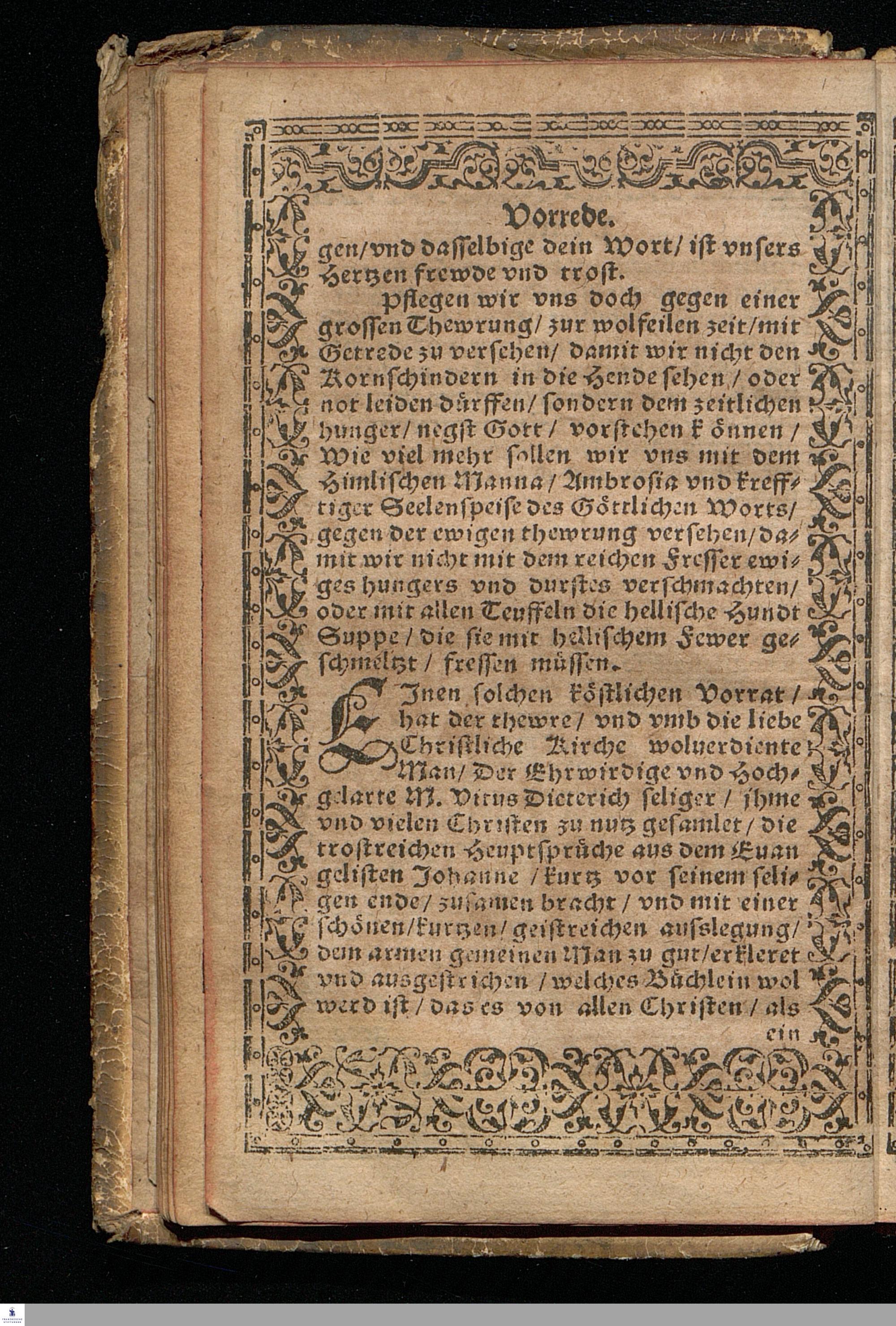 Eine Christliche || Predigt/ || Uber de[n] trost=||reichen Heuptspruch/ Jo=||hannis am dritten Cap. Also || hat Gott die Welt ge=||liebet/ etc. || Gethan durch Mag. Christoff: || Fischer/ Pfarherr zu Halb. || Sampt der Christlichen/ || tröstlichen außlegung/ der für=||nembsten Trostsprüche S. Jo=||hannis/ Welche M. Veit Dieterich/ || kurtz vor seinem abschied/ aus diesem jam=||merthal/ allen Christen zu trost/ vnd || seligem Valete/ zu schreiben || dictirt hat. ||