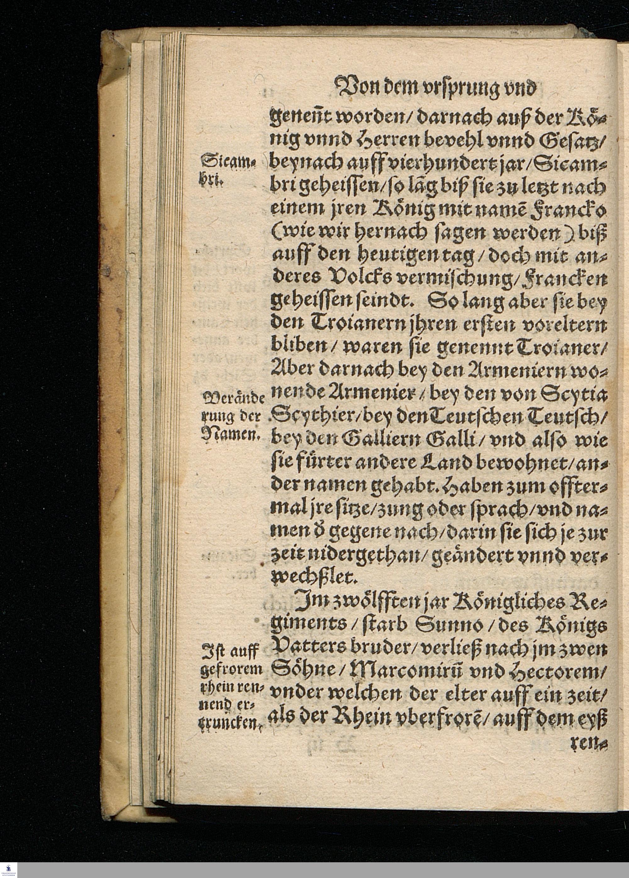 CHRONICA.|| Vom Vrsprung || herkommen/ und zunehmen der || Francken/ Erstlich durch den Ehrwürdigen || und Hochberühmten Herrn Johannem Tritthe=||mium/ weyland Abt zu Spanheim/ auß alten || glaubwürdigen Chronicken/ zusammen gelesen/|| und in Latein beschrieben/ nachmahls durch den || Hochgelehrten Jacob Schenck/ der rechten Do=||ctorn/ verdeutscht/ jetzund aber von newem || mit besonderm fleiß übersehen/ gebes=||sert/ und mit Argumenten || gemehret.||