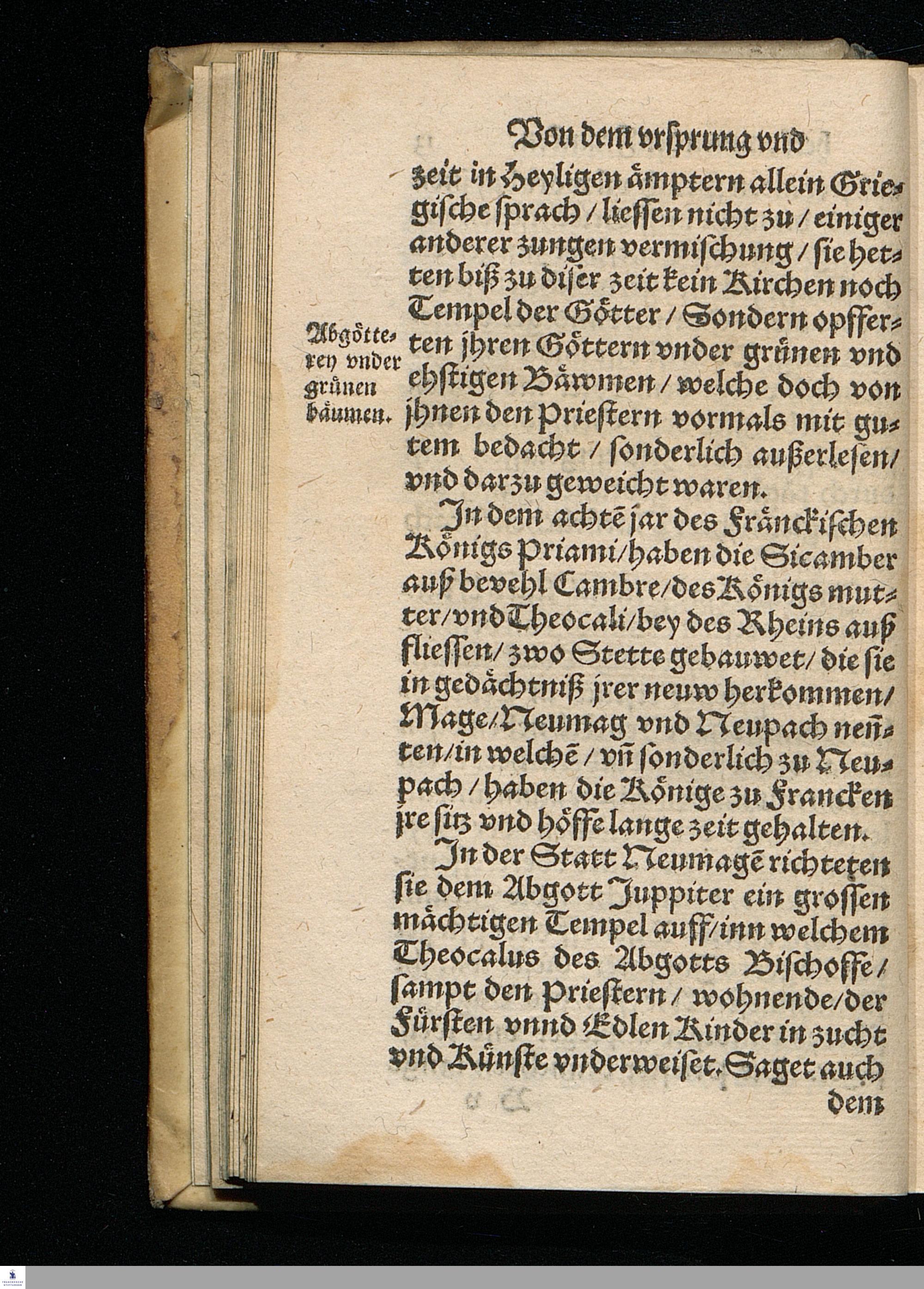 CHRONICA.|| Vom Vrsprung || herkommen/ und zunehmen der || Francken/ Erstlich durch den Ehrwürdigen || und Hochberühmten Herrn Johannem Tritthe=||mium/ weyland Abt zu Spanheim/ auß alten || glaubwürdigen Chronicken/ zusammen gelesen/|| und in Latein beschrieben/ nachmahls durch den || Hochgelehrten Jacob Schenck/ der rechten Do=||ctorn/ verdeutscht/ jetzund aber von newem || mit besonderm fleiß übersehen/ gebes=||sert/ und mit Argumenten || gemehret.||