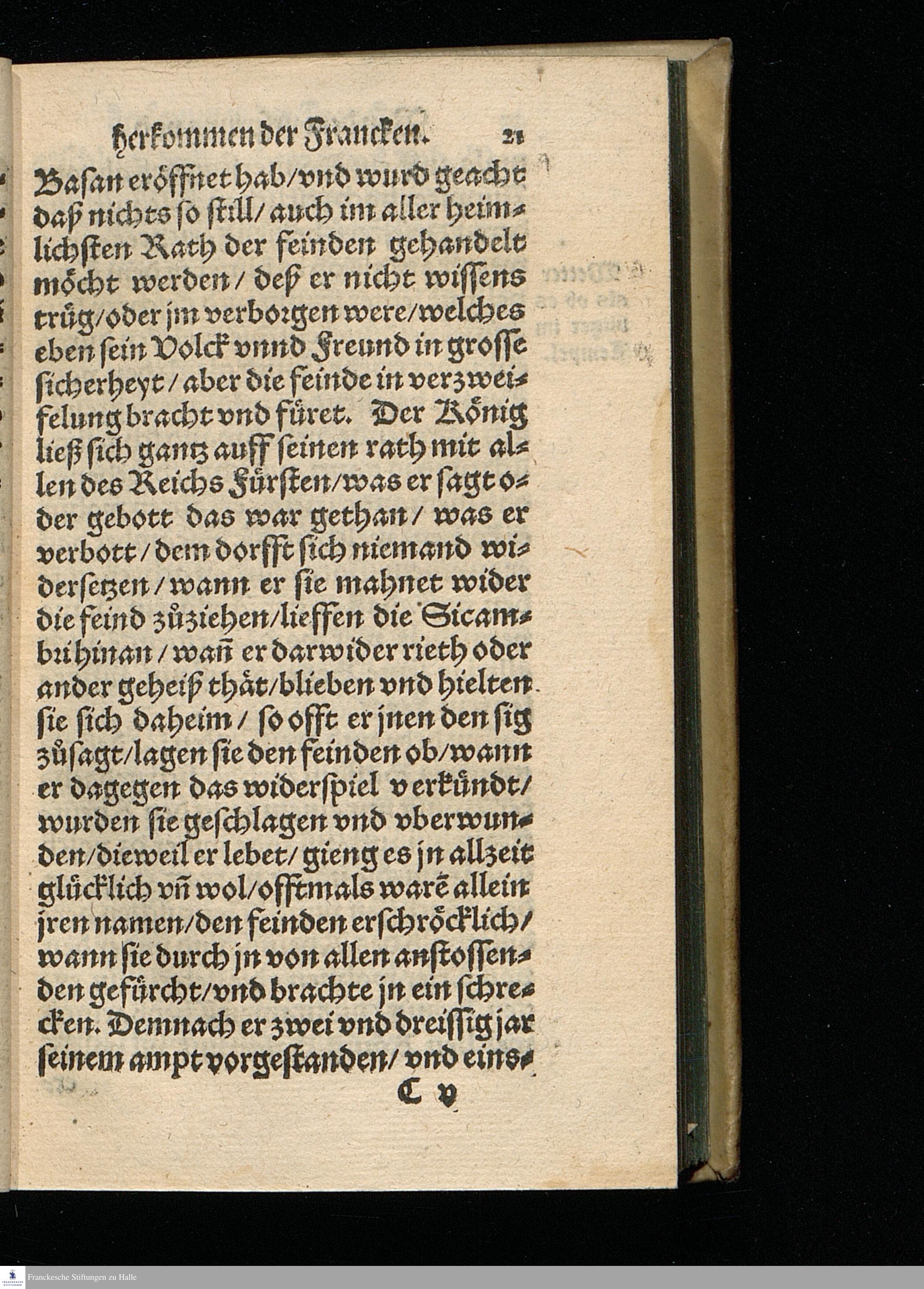 CHRONICA.|| Vom Vrsprung || herkommen/ und zunehmen der || Francken/ Erstlich durch den Ehrwürdigen || und Hochberühmten Herrn Johannem Tritthe=||mium/ weyland Abt zu Spanheim/ auß alten || glaubwürdigen Chronicken/ zusammen gelesen/|| und in Latein beschrieben/ nachmahls durch den || Hochgelehrten Jacob Schenck/ der rechten Do=||ctorn/ verdeutscht/ jetzund aber von newem || mit besonderm fleiß übersehen/ gebes=||sert/ und mit Argumenten || gemehret.||