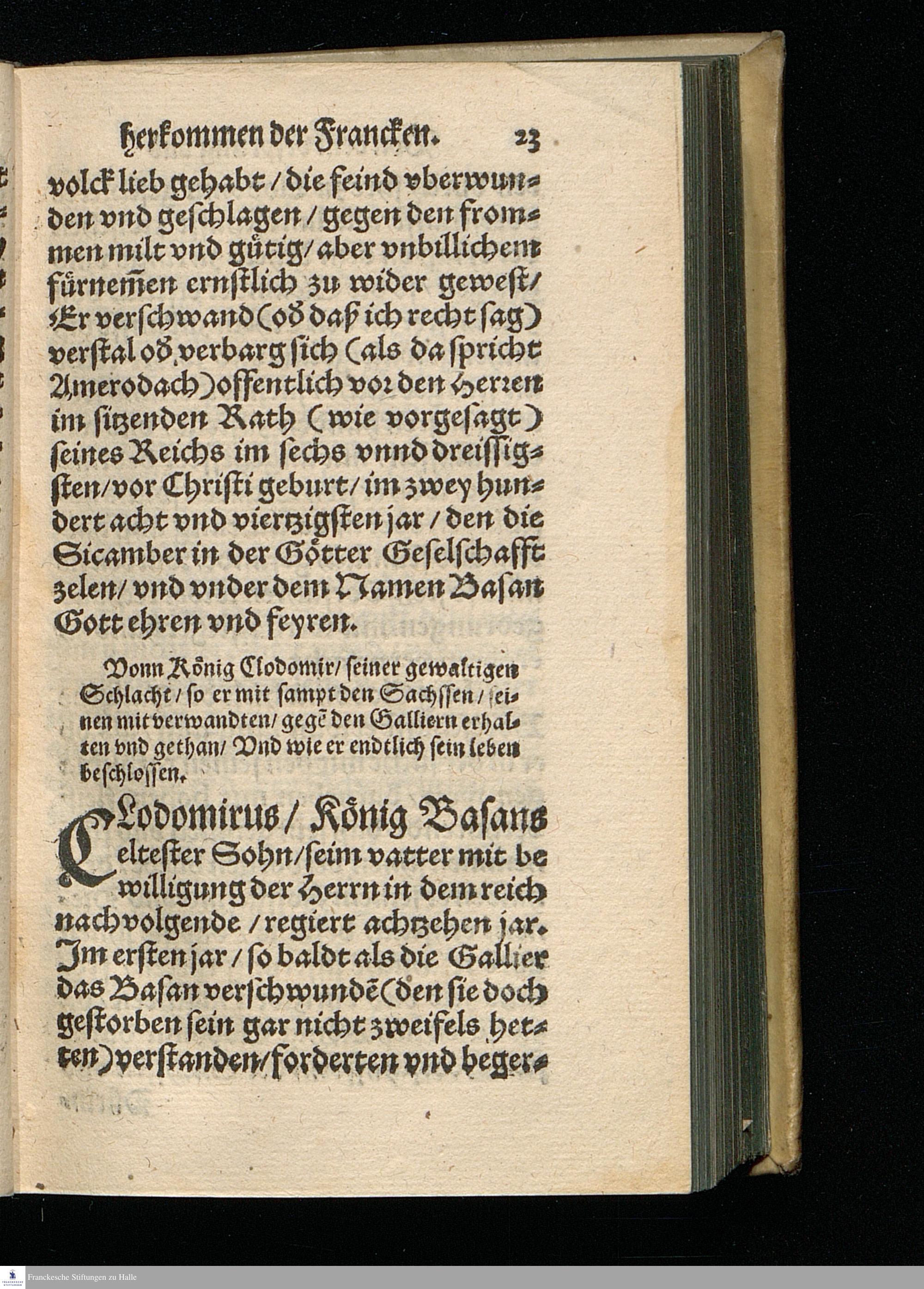 CHRONICA.|| Vom Vrsprung || herkommen/ und zunehmen der || Francken/ Erstlich durch den Ehrwürdigen || und Hochberühmten Herrn Johannem Tritthe=||mium/ weyland Abt zu Spanheim/ auß alten || glaubwürdigen Chronicken/ zusammen gelesen/|| und in Latein beschrieben/ nachmahls durch den || Hochgelehrten Jacob Schenck/ der rechten Do=||ctorn/ verdeutscht/ jetzund aber von newem || mit besonderm fleiß übersehen/ gebes=||sert/ und mit Argumenten || gemehret.||