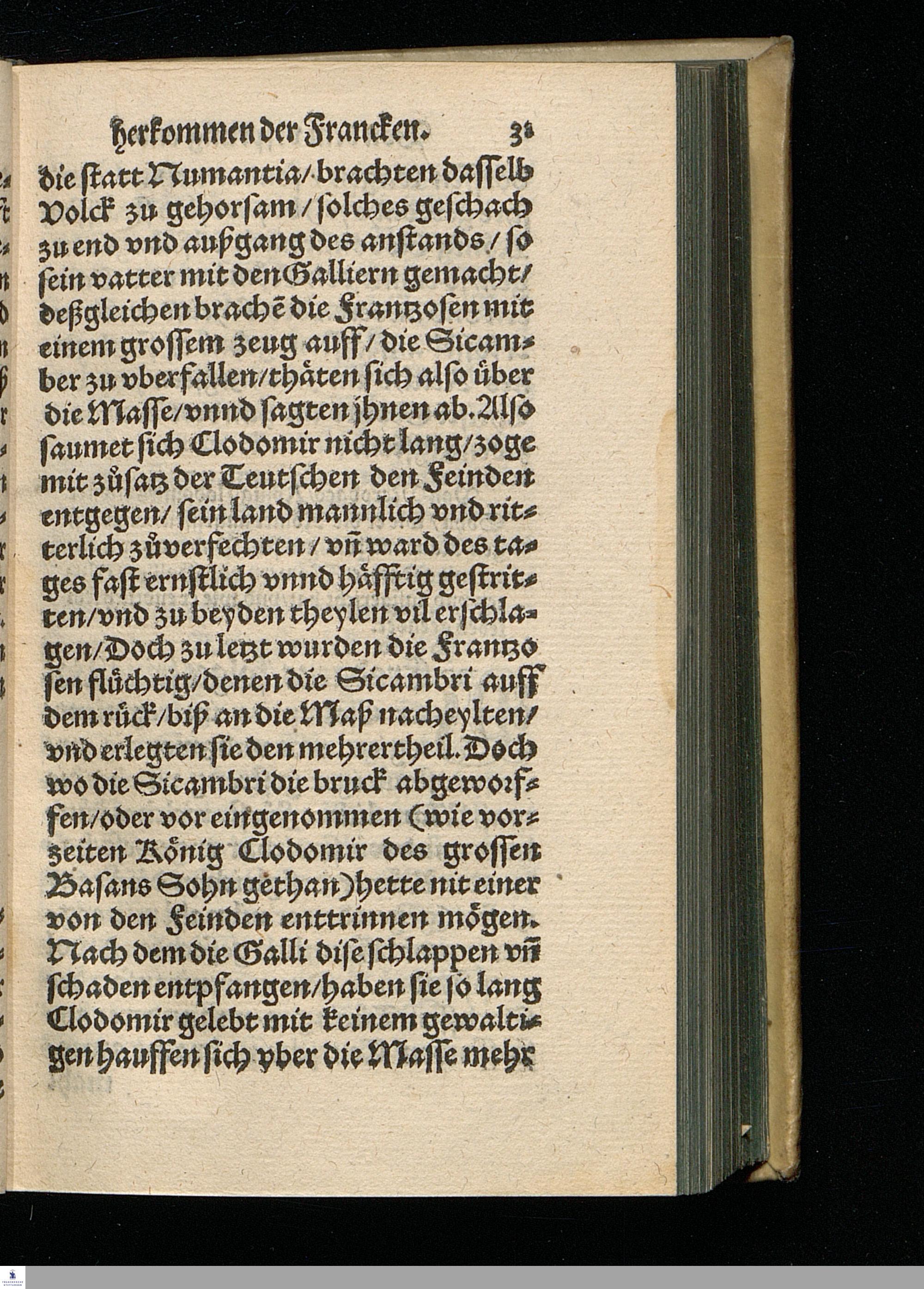 CHRONICA.|| Vom Vrsprung || herkommen/ und zunehmen der || Francken/ Erstlich durch den Ehrwürdigen || und Hochberühmten Herrn Johannem Tritthe=||mium/ weyland Abt zu Spanheim/ auß alten || glaubwürdigen Chronicken/ zusammen gelesen/|| und in Latein beschrieben/ nachmahls durch den || Hochgelehrten Jacob Schenck/ der rechten Do=||ctorn/ verdeutscht/ jetzund aber von newem || mit besonderm fleiß übersehen/ gebes=||sert/ und mit Argumenten || gemehret.||
