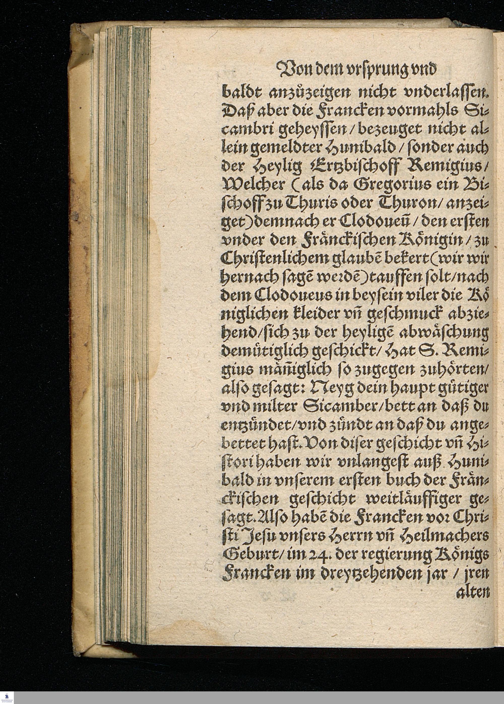 CHRONICA.|| Vom Vrsprung || herkommen/ und zunehmen der || Francken/ Erstlich durch den Ehrwürdigen || und Hochberühmten Herrn Johannem Tritthe=||mium/ weyland Abt zu Spanheim/ auß alten || glaubwürdigen Chronicken/ zusammen gelesen/|| und in Latein beschrieben/ nachmahls durch den || Hochgelehrten Jacob Schenck/ der rechten Do=||ctorn/ verdeutscht/ jetzund aber von newem || mit besonderm fleiß übersehen/ gebes=||sert/ und mit Argumenten || gemehret.||