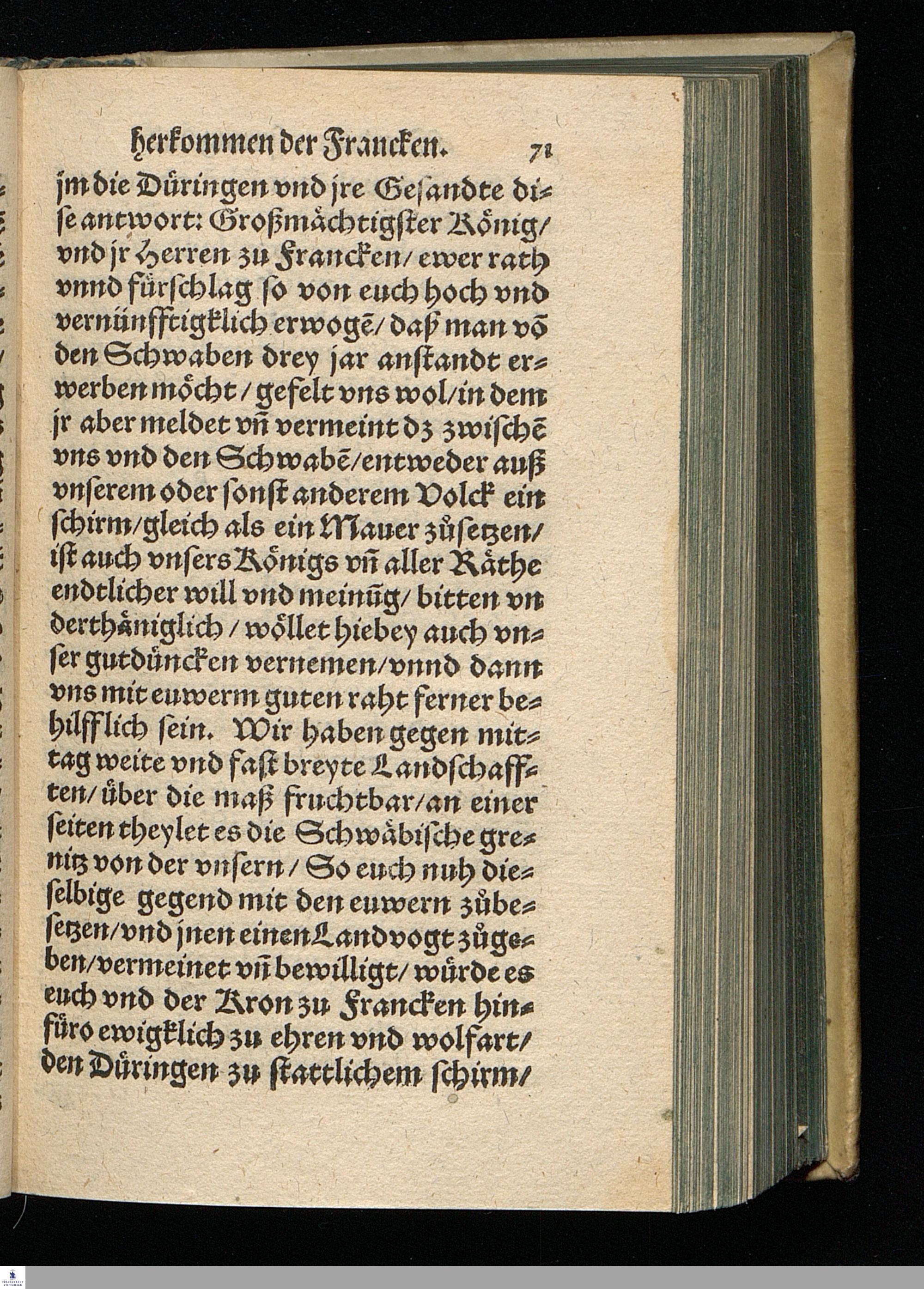 CHRONICA.|| Vom Vrsprung || herkommen/ und zunehmen der || Francken/ Erstlich durch den Ehrwürdigen || und Hochberühmten Herrn Johannem Tritthe=||mium/ weyland Abt zu Spanheim/ auß alten || glaubwürdigen Chronicken/ zusammen gelesen/|| und in Latein beschrieben/ nachmahls durch den || Hochgelehrten Jacob Schenck/ der rechten Do=||ctorn/ verdeutscht/ jetzund aber von newem || mit besonderm fleiß übersehen/ gebes=||sert/ und mit Argumenten || gemehret.||