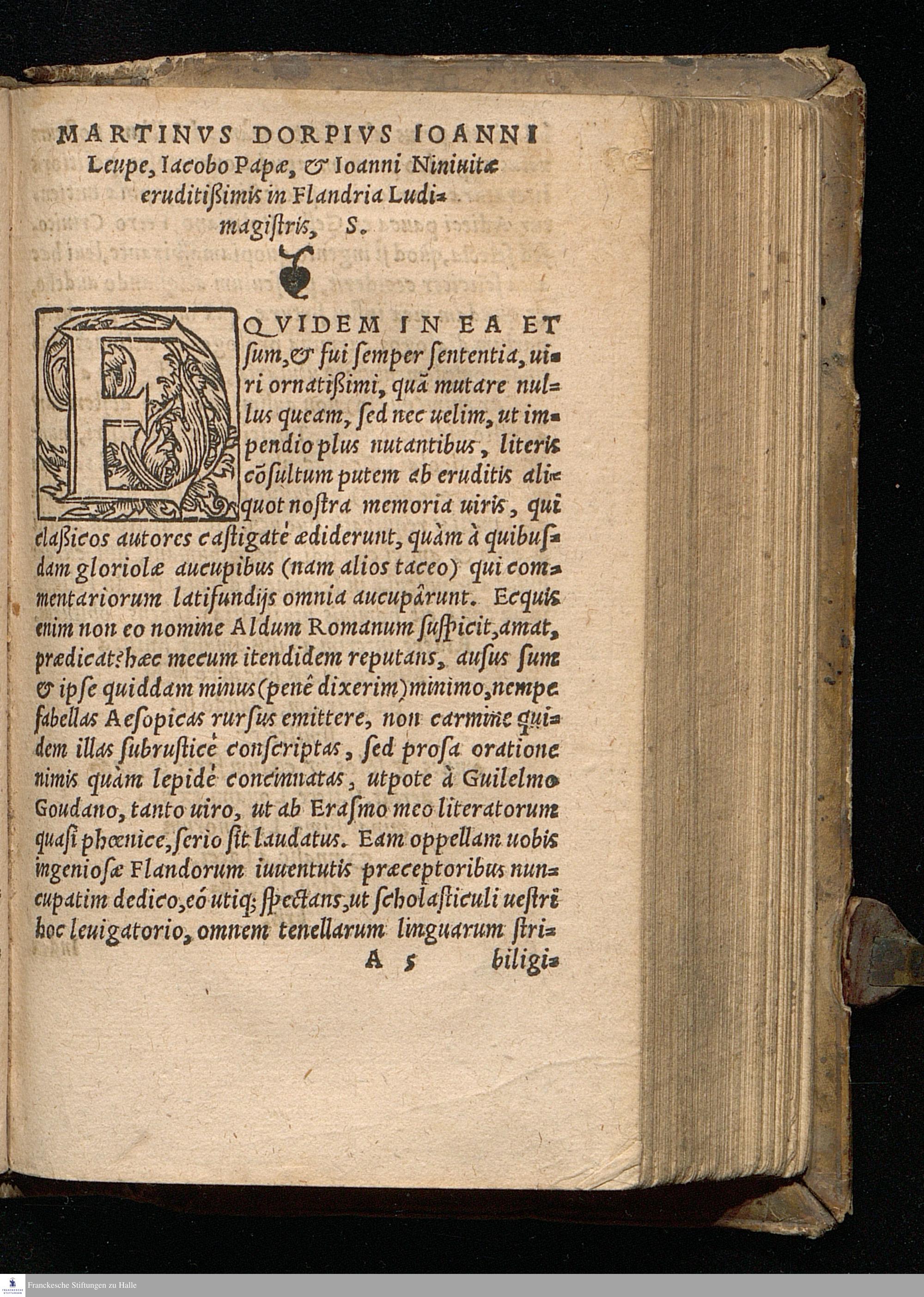 FABVLA=||RVM QVAE HOC LI=||bro continentur, Interpretes atq; || authores sunt hi.|| Guilelmus Goudanus.|| Hadrianus Barlandus.|| Erasmus Roterodamus.|| Aulus Gellius.|| Laurentius Valla.|| Angelus Politianus.|| Petrus Crinitus.|| Ioannes Anthonius Campanus.|| Plinius secundus Nouocomensis.|| Anianus, Guilelmus Hermannus.|| Nicolaus Gerbellius Phorcensis.|| Laurentius Abstemius.|| Rimicius iam denuo additus.|| Aesopi uita ex Maximo Planude excer=||pta et aucta.|| Indicem fabularum in uestibulo reperies.||