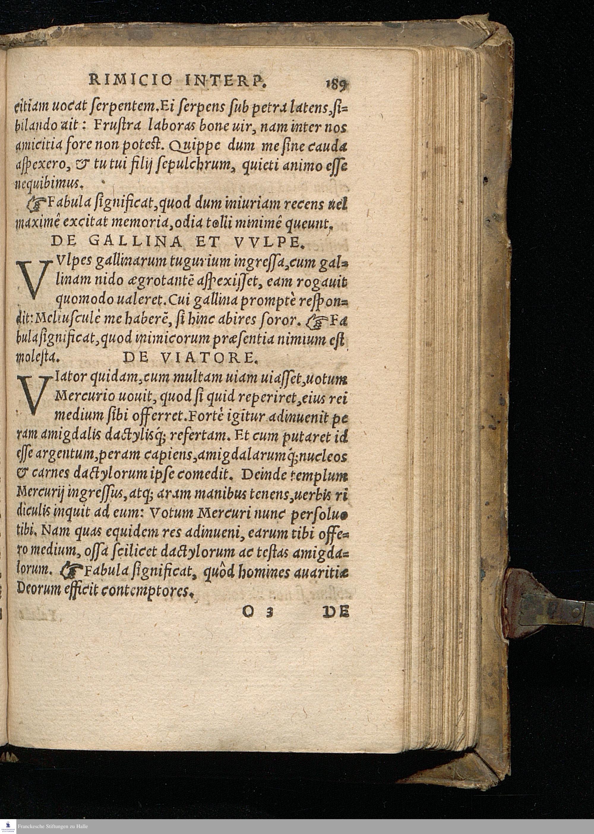 FABVLA=||RVM QVAE HOC LI=||bro continentur, Interpretes atq; || authores sunt hi.|| Guilelmus Goudanus.|| Hadrianus Barlandus.|| Erasmus Roterodamus.|| Aulus Gellius.|| Laurentius Valla.|| Angelus Politianus.|| Petrus Crinitus.|| Ioannes Anthonius Campanus.|| Plinius secundus Nouocomensis.|| Anianus, Guilelmus Hermannus.|| Nicolaus Gerbellius Phorcensis.|| Laurentius Abstemius.|| Rimicius iam denuo additus.|| Aesopi uita ex Maximo Planude excer=||pta et aucta.|| Indicem fabularum in uestibulo reperies.||