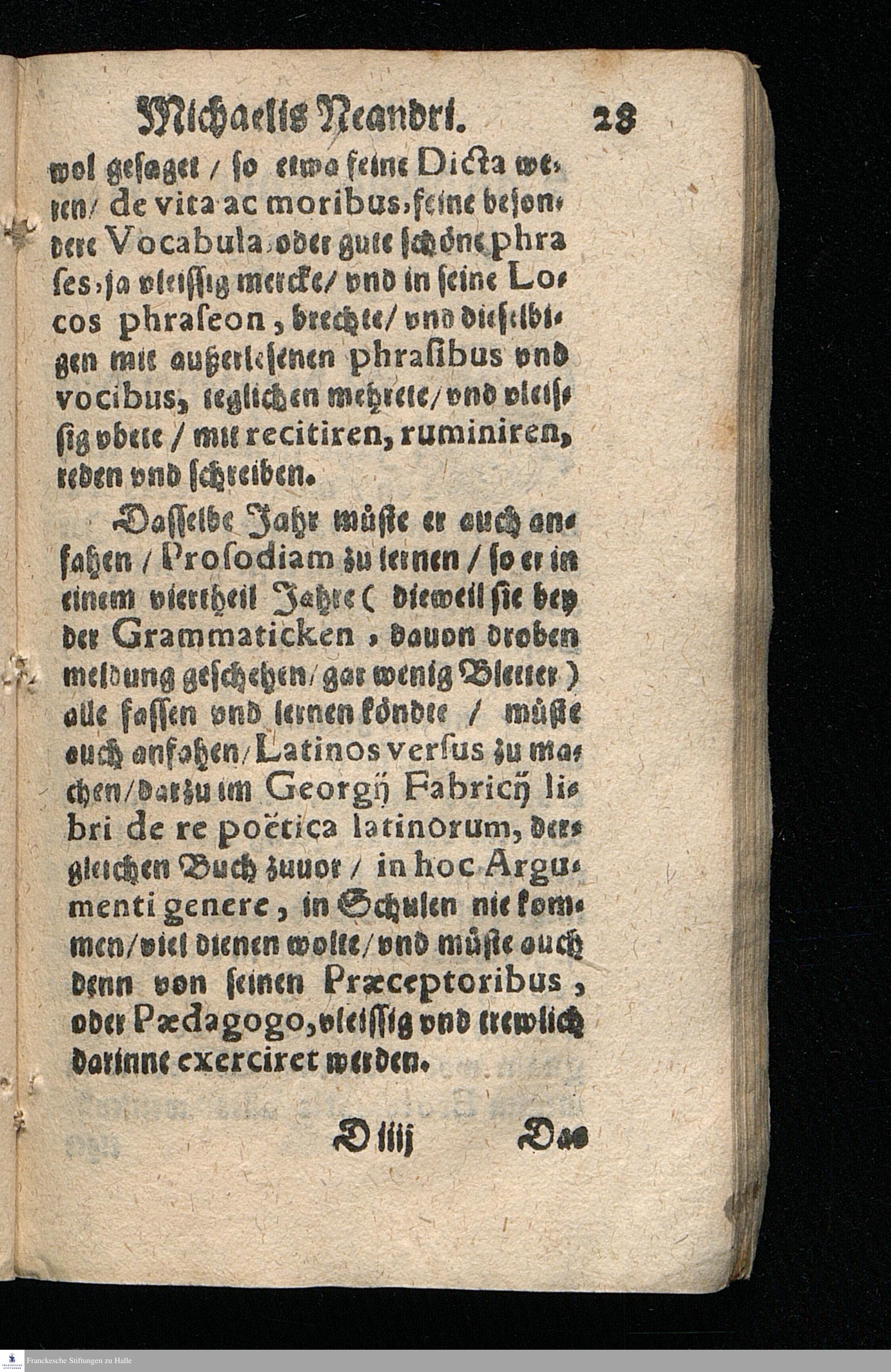 MICHAELIS || NEANDRI || Bedencken/ || Wie ein Knabe zu vnter-||weisen/ Das er one groß jagen/ || treiben/ vnd eilen/ mit Lust vnd Liebe/ || vom sechsten Jahr seines alters an/ biß auff || das achtzehende/ wol vnd fertig lernen möge/ || Pietatem, linguam Latinam, Græcam, He=||bræam, Artes, Vnd endlich vniuer=||sam Philosophiam. || Zum Fünfftenmal vberse-||hen/ mit einem Büchlein de mo-||ribus Puerorum decentibus, || Auch anderm nützlichen vnd || nötigem Bericht || verbessert. ||