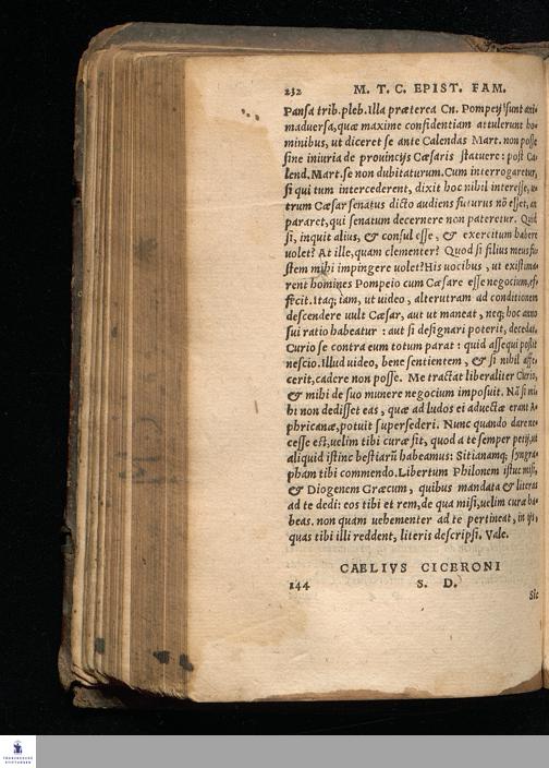 M. T. CICE=||RONIS EPISTO-||LAE AD COMPLVRES || SCRIPTAE, QVAS VVLGO || FAMILIARES APPEL=||LARVNT, || CVM ARGVMENTIS GI-||berti Longolij, editæ || DE SENTENTIA IOACHIMI || CAMERARII PABEPER=||GENSIS. || ACCESSERVNT. || Eiusdem IOACHIMI CAMERARII in hos epi=||stolarum libros castigationes, ... Interpretatio Latina Græcarum uocum. ||