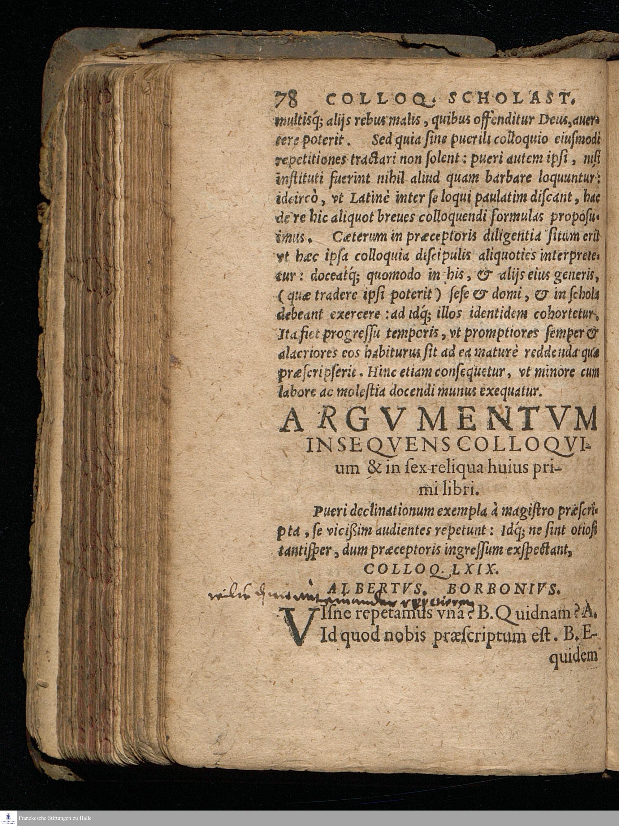 MATHURINI CORDERII || COLLOQVI=||ORVM SCHOLASTI=||CORVM LIBRI IIII. CVM AR=||gumentis, & restitutione eorum, quæ in pon-||tificia editione vel deprauata fue-||rant, vel omissa. || Nunc in gratiam & vsum Scholarum Ger-||manicarum denuo excusi. ||