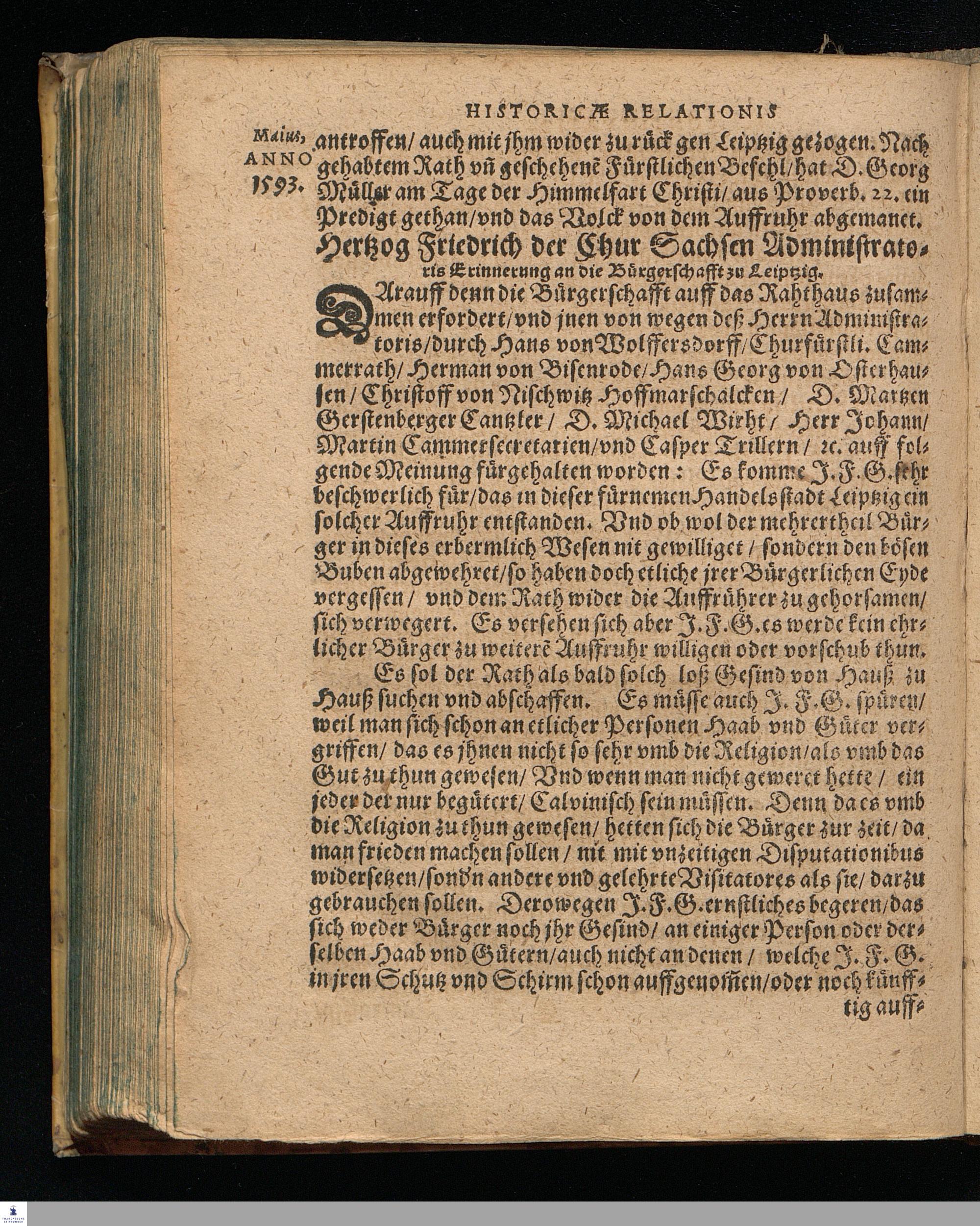 HISTORICAE RELA=||TIONIS CONTI=||NVATIO.|| Warhafftige Beschreibung || aller fürnemen vnd gedenckwirdigen Geschichte/|| so sich in Hoch vnd Nider Teutschlandt/ Polen/ Franckreich/|| Saphoy/ Jtalia/ Hungern/ Crabaten/Türkey vnd Persia/ sonderlich || aber in Sachsen vñ im Bistumb Straßburg/ hiezwischen nechst verschie=||ner Franckfurter Fastenmeß vnd etliche Monat daruor/ biß in || gegenwertige Herbstmeß/ Anno 1593. ver=||lauffen vnd zugetragen || haben.|| ... Durch || JACOBVM FRANCVM || Der Historien Liebhaber.||
