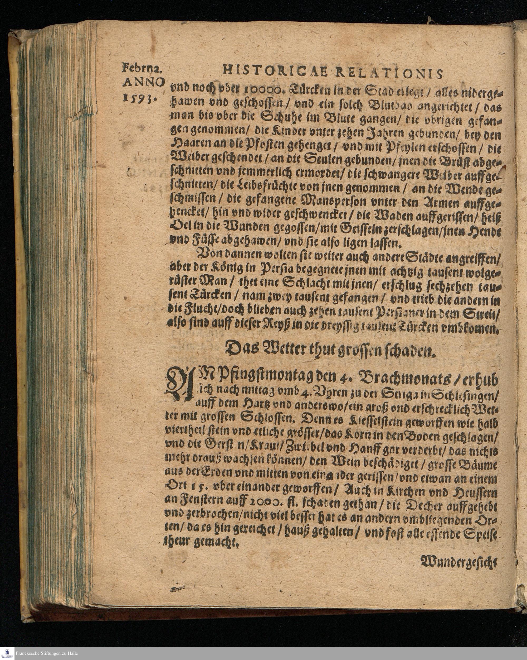 HISTORICAE RELA=||TIONIS CONTI=||NVATIO.|| Warhafftige Beschreibung || aller fürnemen vnd gedenckwirdigen Geschichte/|| so sich in Hoch vnd Nider Teutschlandt/ Polen/ Franckreich/|| Saphoy/ Jtalia/ Hungern/ Crabaten/Türkey vnd Persia/ sonderlich || aber in Sachsen vñ im Bistumb Straßburg/ hiezwischen nechst verschie=||ner Franckfurter Fastenmeß vnd etliche Monat daruor/ biß in || gegenwertige Herbstmeß/ Anno 1593. ver=||lauffen vnd zugetragen || haben.|| ... Durch || JACOBVM FRANCVM || Der Historien Liebhaber.||