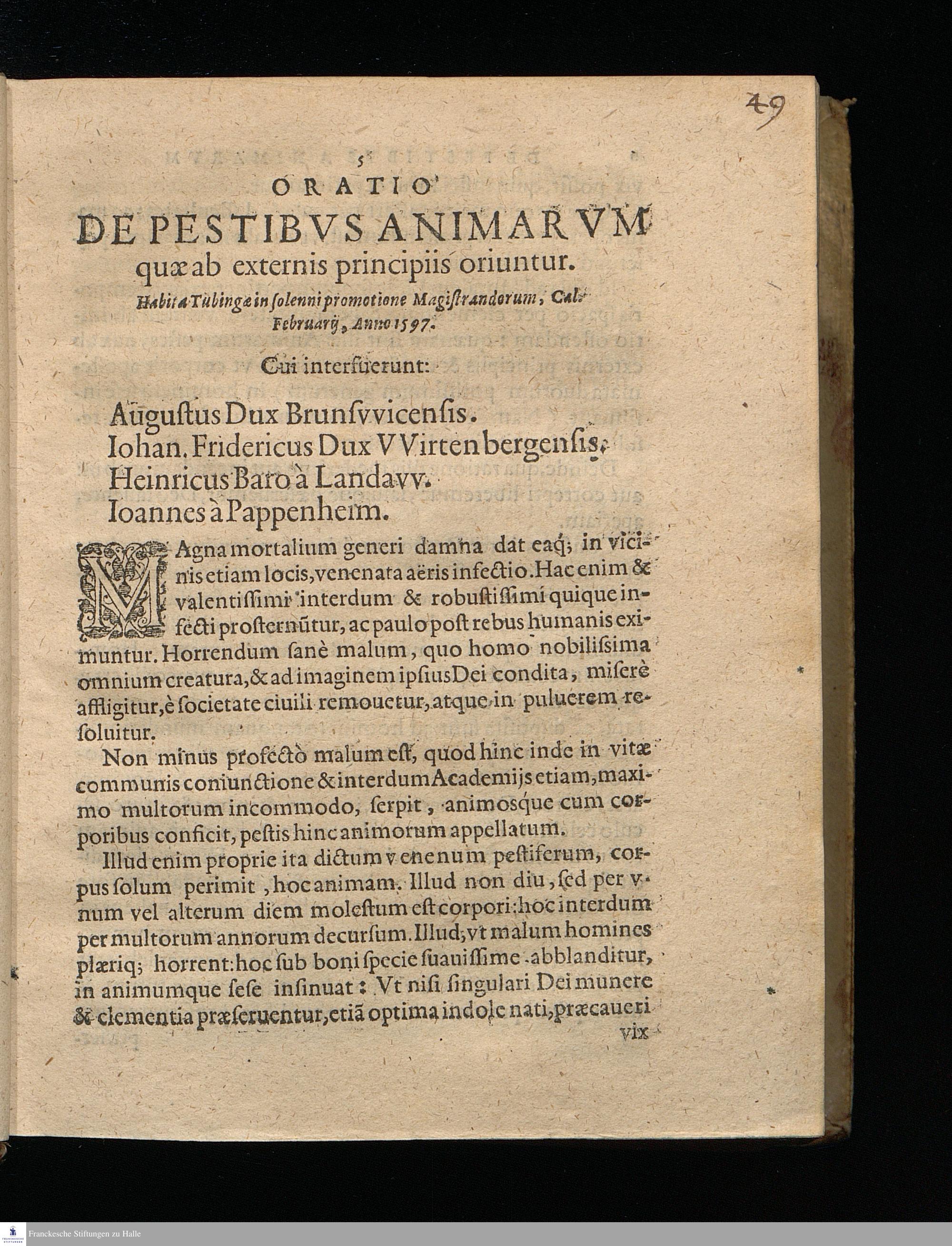 ACTVS MAGISTRORVM PHILO-||SOPHIAE DVO:|| Continentes || ORATIONES,|| DE ANIMARVM || PESTIBVS, QVIBVS INNVMERI || HOMINES OMNIBVS SECVLIS INFECTI || SVNT; VBI OSTENDITVR, QVOMODO TAMPER-||niciosa mala vitari & effugi pos-||sint.|| Habitas à || VITO MVLLERO, PROFESSORE || Moralis Philosophiae in Academia Tubingensi: cum Philoso-||phicos Iuuenibus honestis quinquaginta octo || tribueret.||