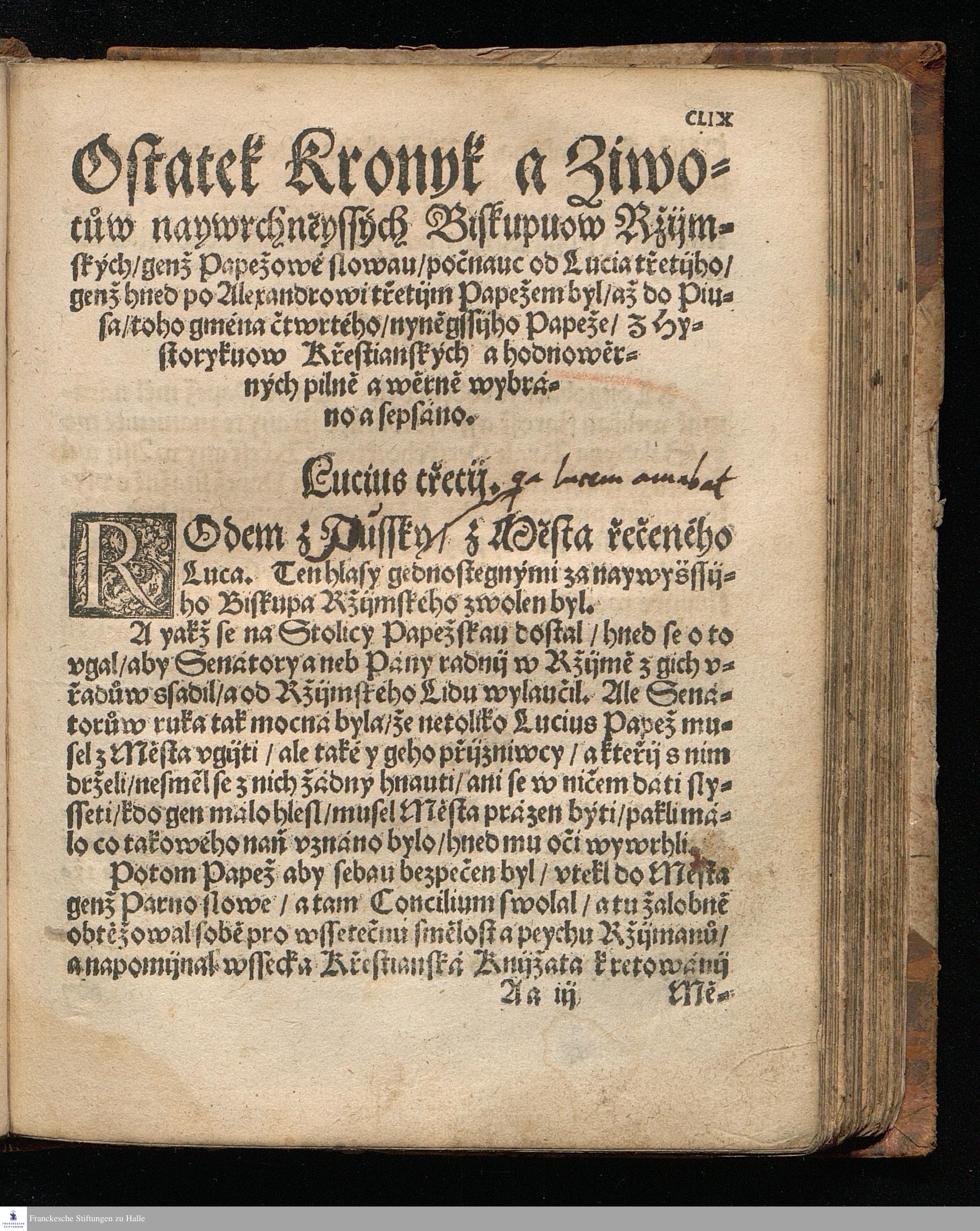 Kronyky.|| A žiwotuow sepsánij nay=||wrchněgssých Biskupuow Ržijmstých/ gmáč || Papežůw/ pilně a wěrně z mnohých Historij kratijčce wy=||bráno a sepsáno ... ||