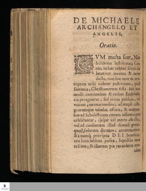 ORATIO || DE MICHAELE || ARCHANGELO || ET ANGELIS.|| Habita ab || ÆGIDIO HVNNIO,|| S. THEOL. DOCTORE ET || Professore in Academia VVi=||tebergensi, in Auditorio || Novo.|| Praefixa est Rectoris Magnifici Intimatio, qua ad || audiendam eam Orationem cœtus Scho-||lasticus invitatus est.||