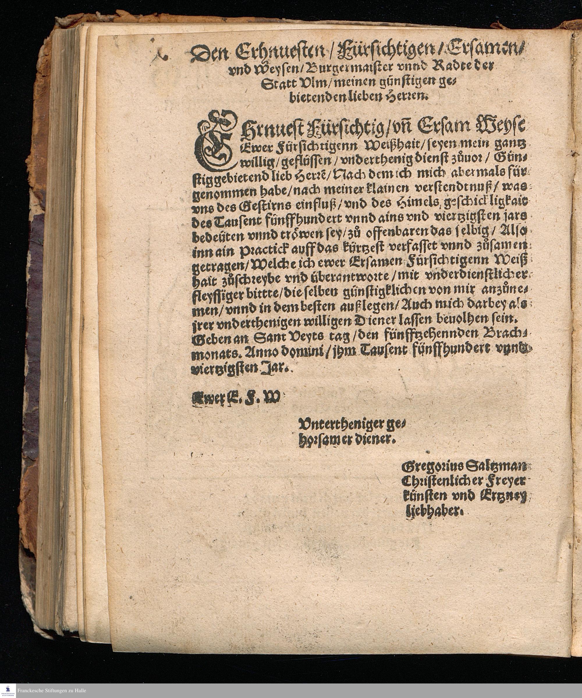 Practica Teütsch/ Auf dz || M. CCCCC. vnd xlj. Jare/ durch Gregorium || Saltzman/ zů Vlm bestelten leyb artzt/ Den ... || Burg||ermaister vnnd radt der Kayserlichen Stat || Vlm zů Eehren beschriben #[et]c.|| ... ||