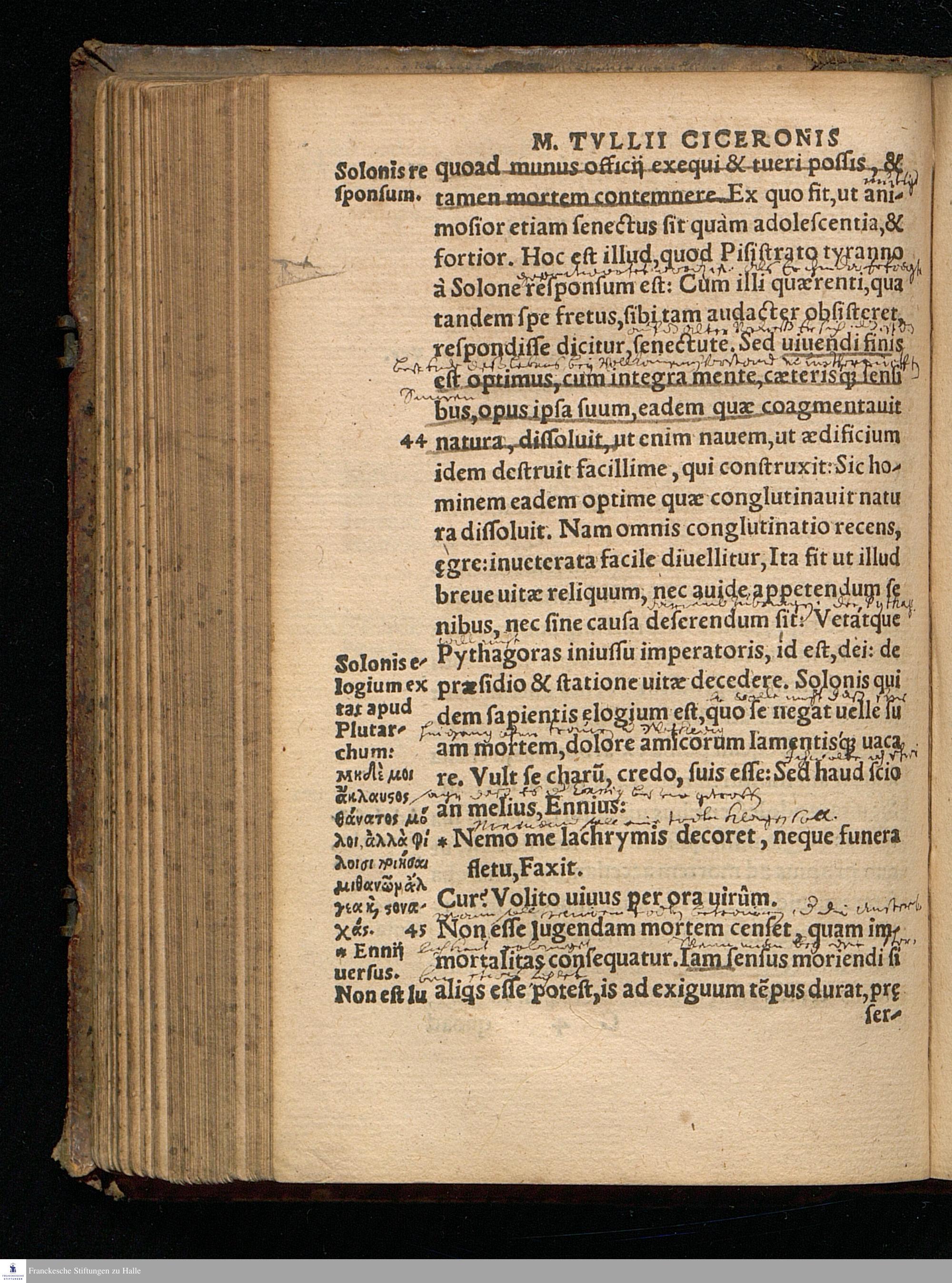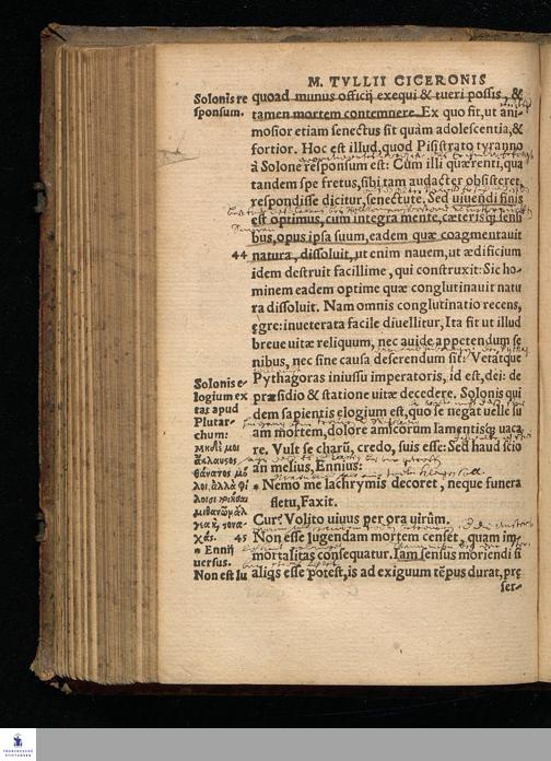 MAR-||CI TVLLII CI-||ceronis Liber de || Senectute. || CVM ANNOTATIO-||nibus Erasmi... DIALOGVS. INTERLOCVTORES, P. Scipio, C. Laelius, & Cato. SCIPIO.