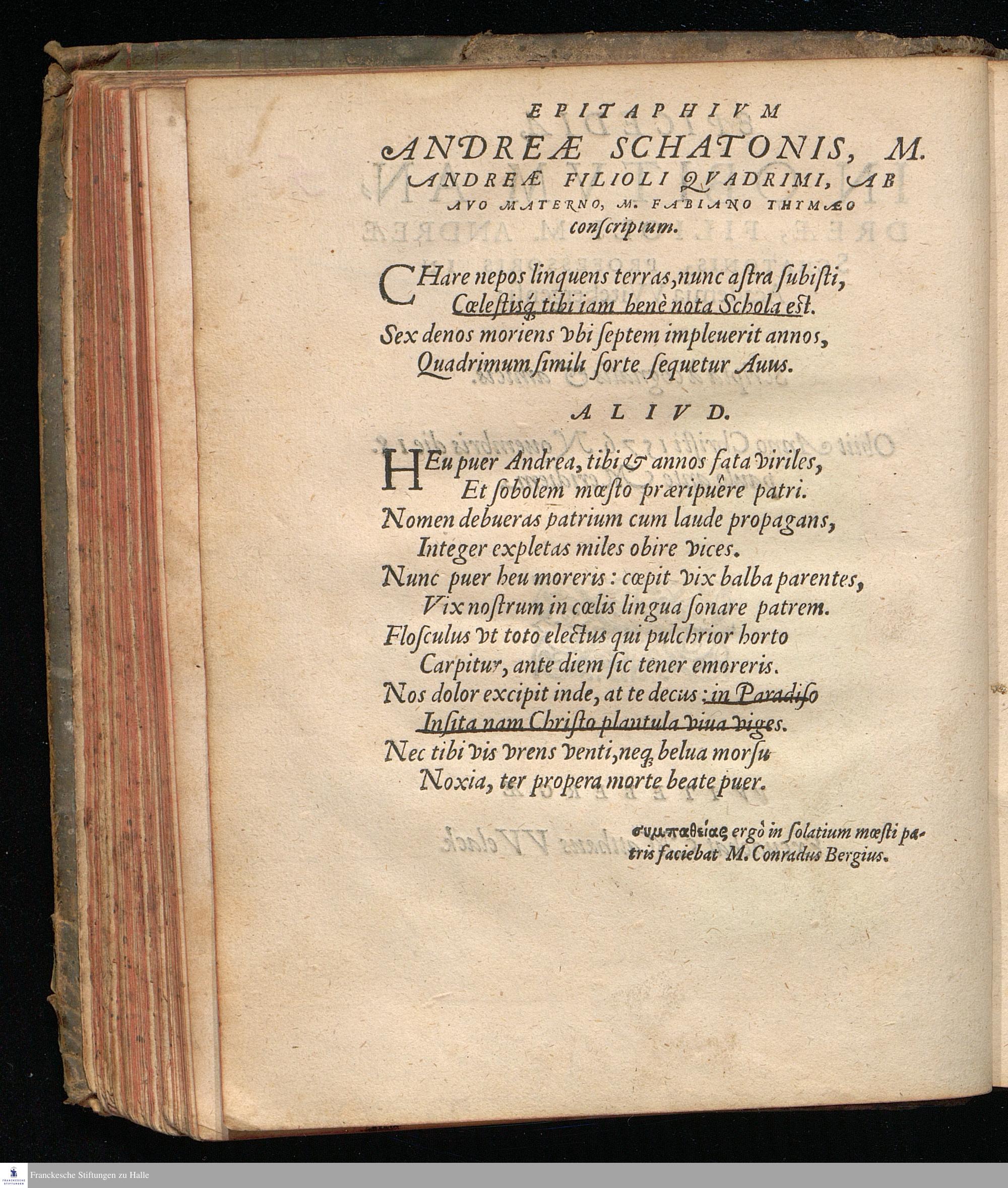 EPICEDIA, || IN OBITVM AN=||DREÆ, FILIOLI M. ANDREÆ || SCHATONIS, PROFESSORIS IN || Academia VVitebergensi: || Scripta à cognatis & amicis. || Obiit Anno Christi 1576. Nouembris die 18. || paulò ante Meridiem. ||