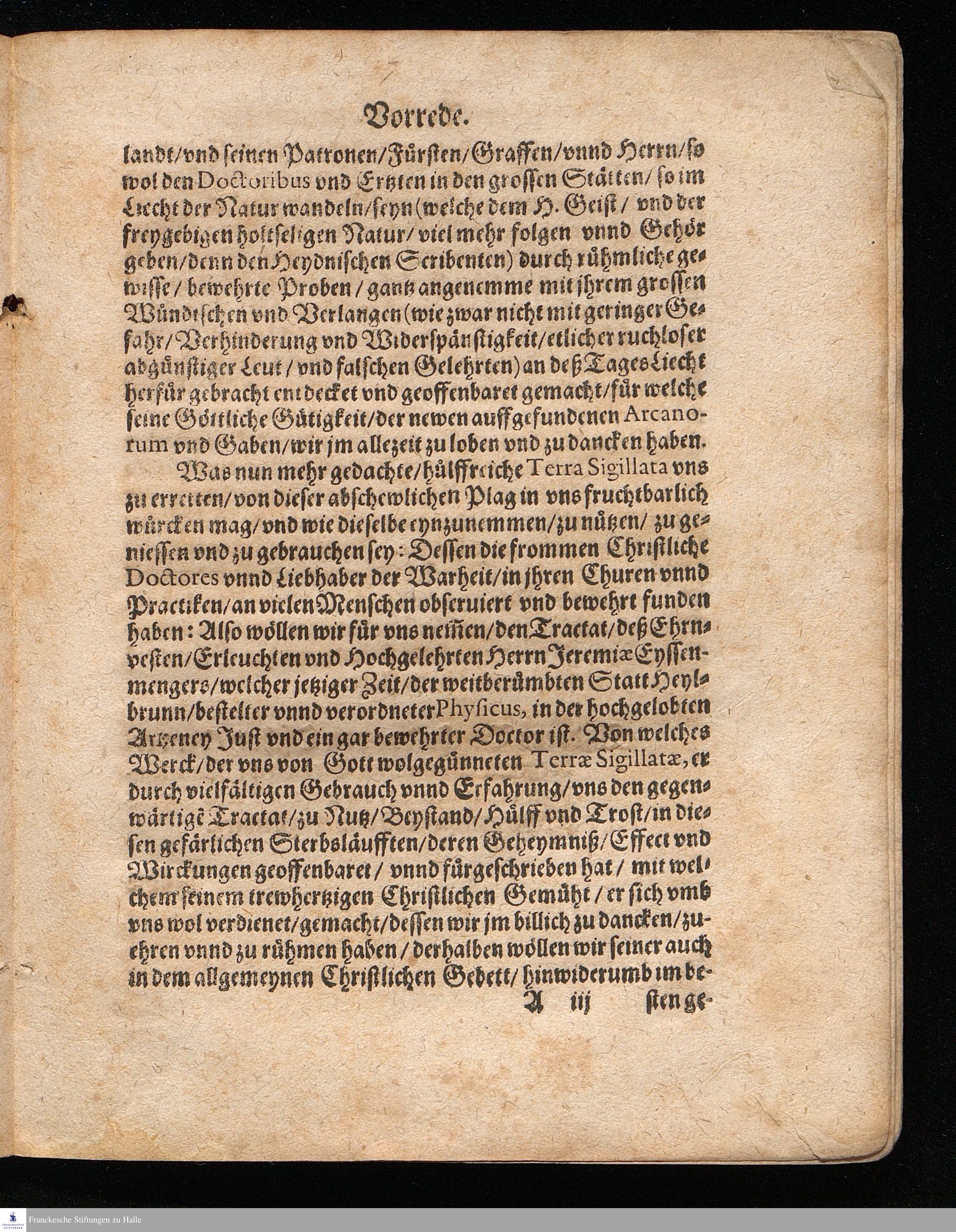 Nützlicher vnnd Nothwendiger Bericht: || Wie man in diesen ge=||fährlichen Sterbensläufften/ wider die || Pestilentz/ die wahre Terram Sigillatam || gebrauchen soll/ Gestellt vnd verordnet/ || Durch den Ehrnvesten/ Hochgelarten/ im || Liecht der Natur hocherleuchten Philosophum, || Herrn Ieremiam Eysenmenger/ Der hochgelobten Artz=||ney Doctorn/ bestellten vnnd verordneten || Physicum, zu Heylbrun. || Welche Hülffreiche Terram Sigillatam, vnnd hohen Antido-||tum, Der Ehrn: vnd weitberümbte Naturkündiger/ Andreas Bertholdus || von Oschatz/ der verborgenen Arcanen/ im Gebirge Bergmeister/ erstlich || auff dem Kupfferberg/ vnd andern Orten mehr/ erfunden/ nach rechtschaf=||fener Kunst præpariert/ gradieret vnd Exaltieret: Vnd nunmehr/ nach vie=||len bewehrten Proben/ beweißlichen vnnd gewissen Zeugnussen/ jüngsten/ auffgehaltenem Reichßtage zu Regenspurg/ denn Ständen vnnd || Gliedern/ deß Heyligen Römischen Reichs/ in vnterthänig=||keit/ præsentirt/ publiciert/ vnnd an deß Tags || Liecht herfür gebracht hat. ||