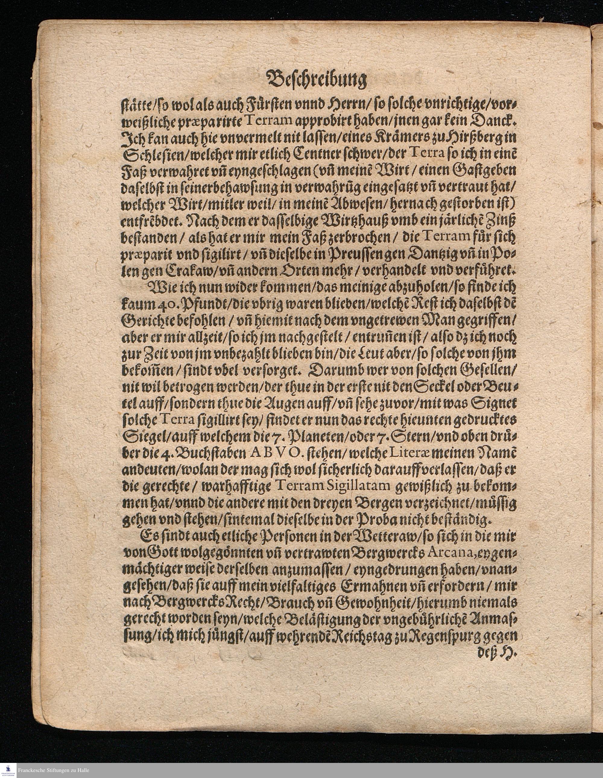 Nützlicher vnnd Nothwendiger Bericht: || Wie man in diesen ge=||fährlichen Sterbensläufften/ wider die || Pestilentz/ die wahre Terram Sigillatam || gebrauchen soll/ Gestellt vnd verordnet/ || Durch den Ehrnvesten/ Hochgelarten/ im || Liecht der Natur hocherleuchten Philosophum, || Herrn Ieremiam Eysenmenger/ Der hochgelobten Artz=||ney Doctorn/ bestellten vnnd verordneten || Physicum, zu Heylbrun. || Welche Hülffreiche Terram Sigillatam, vnnd hohen Antido-||tum, Der Ehrn: vnd weitberümbte Naturkündiger/ Andreas Bertholdus || von Oschatz/ der verborgenen Arcanen/ im Gebirge Bergmeister/ erstlich || auff dem Kupfferberg/ vnd andern Orten mehr/ erfunden/ nach rechtschaf=||fener Kunst præpariert/ gradieret vnd Exaltieret: Vnd nunmehr/ nach vie=||len bewehrten Proben/ beweißlichen vnnd gewissen Zeugnussen/ jüngsten/ auffgehaltenem Reichßtage zu Regenspurg/ denn Ständen vnnd || Gliedern/ deß Heyligen Römischen Reichs/ in vnterthänig=||keit/ præsentirt/ publiciert/ vnnd an deß Tags || Liecht herfür gebracht hat. ||