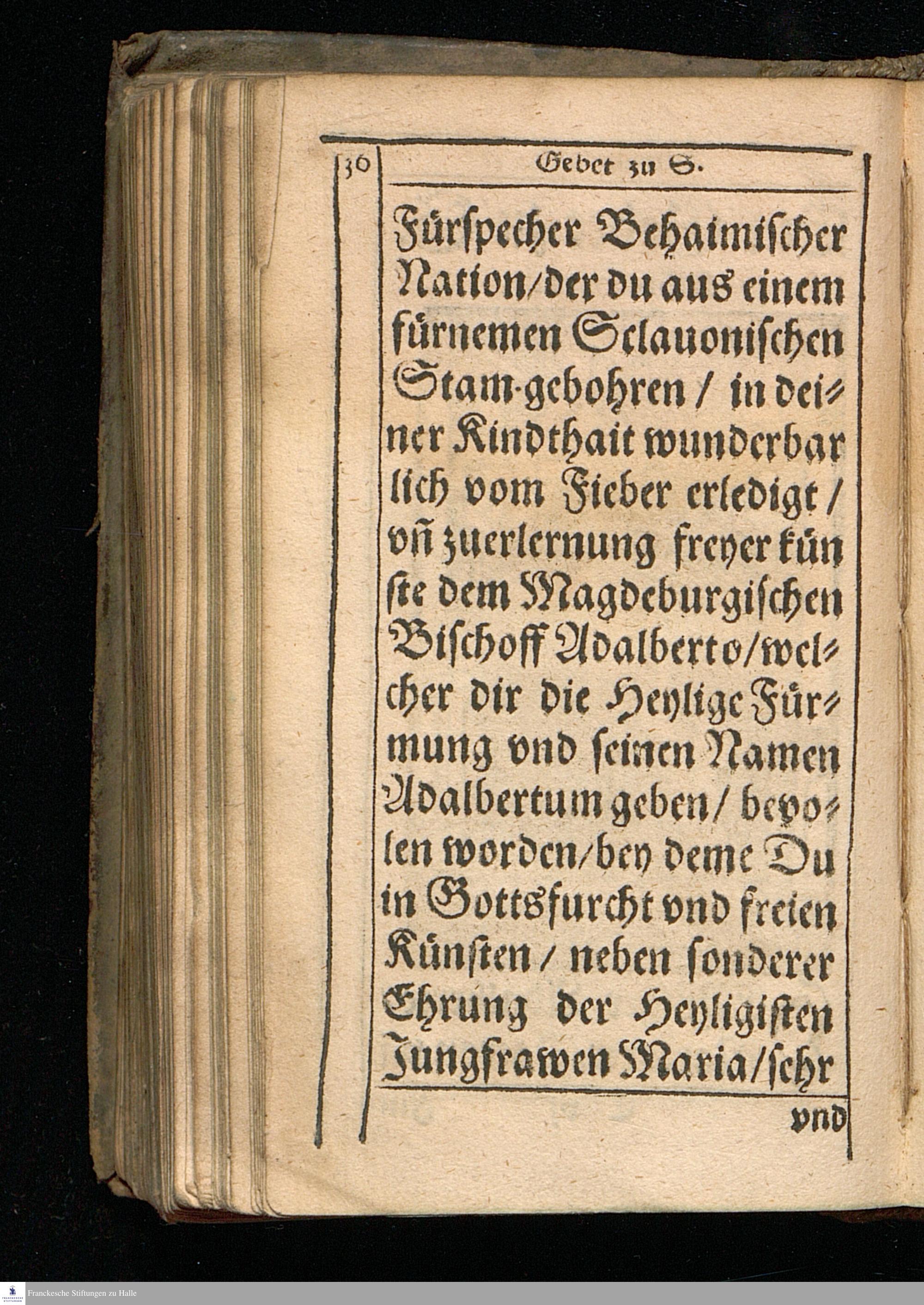 Geistliches Frolocken der || Kron Behaim. || Das ist/ || SChöne/ aus=||erlesene/ Andechtige vnd || sonderlich aber/ dieser gefährlichen Zeit || der Pestilentz/ gar Heylsame vnd Noth=||wendig Gebet/ zu den Fürnemsten H. Pa=||tronen/ darinnen auch auffs kürtzist jhr || jedes Leben vnd Wandel begrieffen/ alles || auff vieler Guthertzigen Christen an=||suchen/ in diese Form gebracht. || Durch || Den Ehrwirdige[n] vn[d] Edlen Herrn || Georgen Bartholdum Pontanum von || Braitenberg/ ThumbProbsten zu Prag || zu Olmutz vnd Budiss. Can. Com. || Pal. Proth. Apost. &c. || ... ||