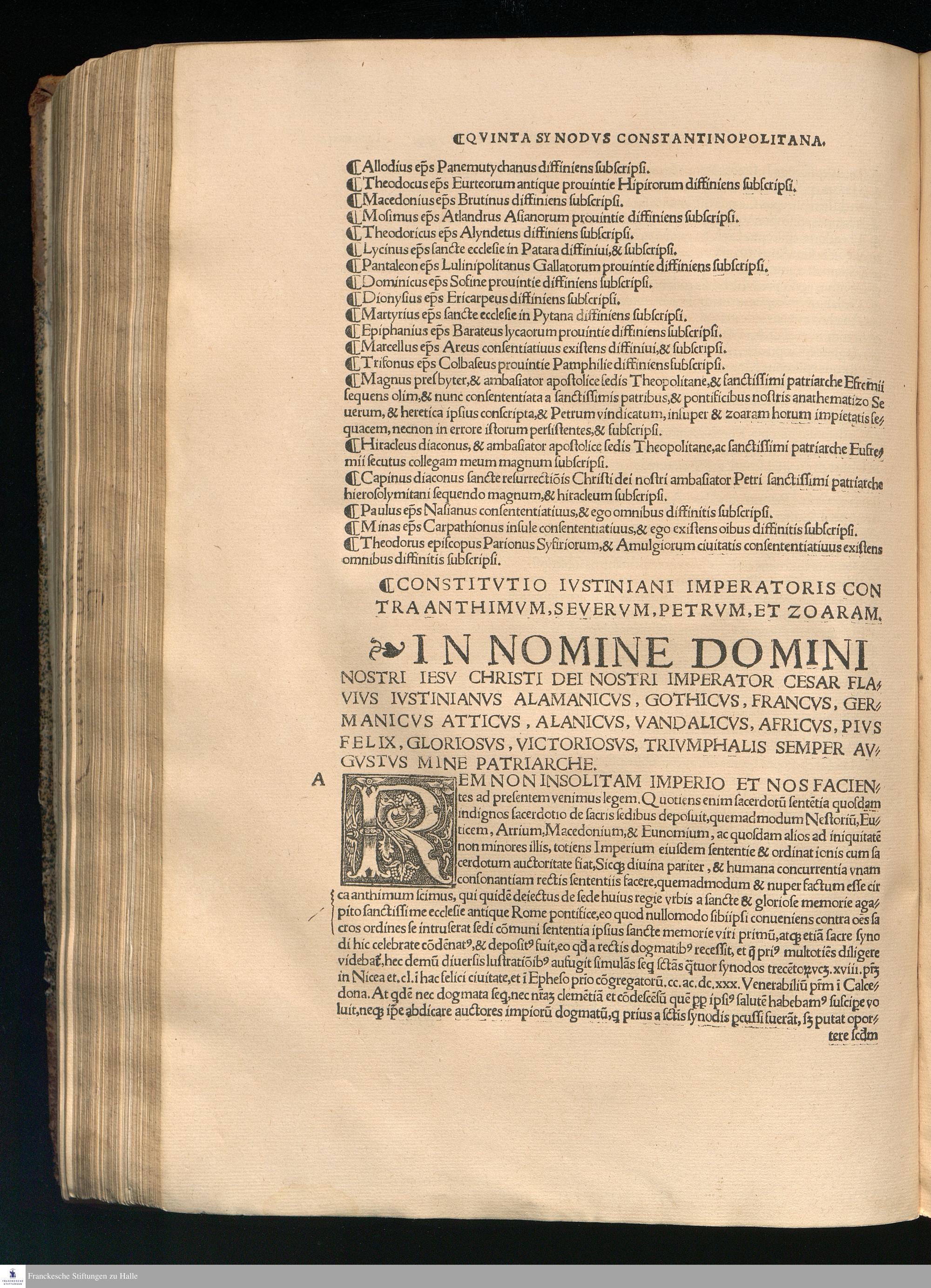 T. 2 (1524) SECVNDVS || TOMVS CONCI||liorum generalium.|| Practica quinte Synodi Constantinopolitane. || Sexta Synodus Constantinopolitana. || Acta concilii Constantiensis. || Decreta concilii Basiliensis. || Approbatio actorum concilii Basiliensis per N. P. || Confirmatio constitutionum Frederici, & Karoline. ||