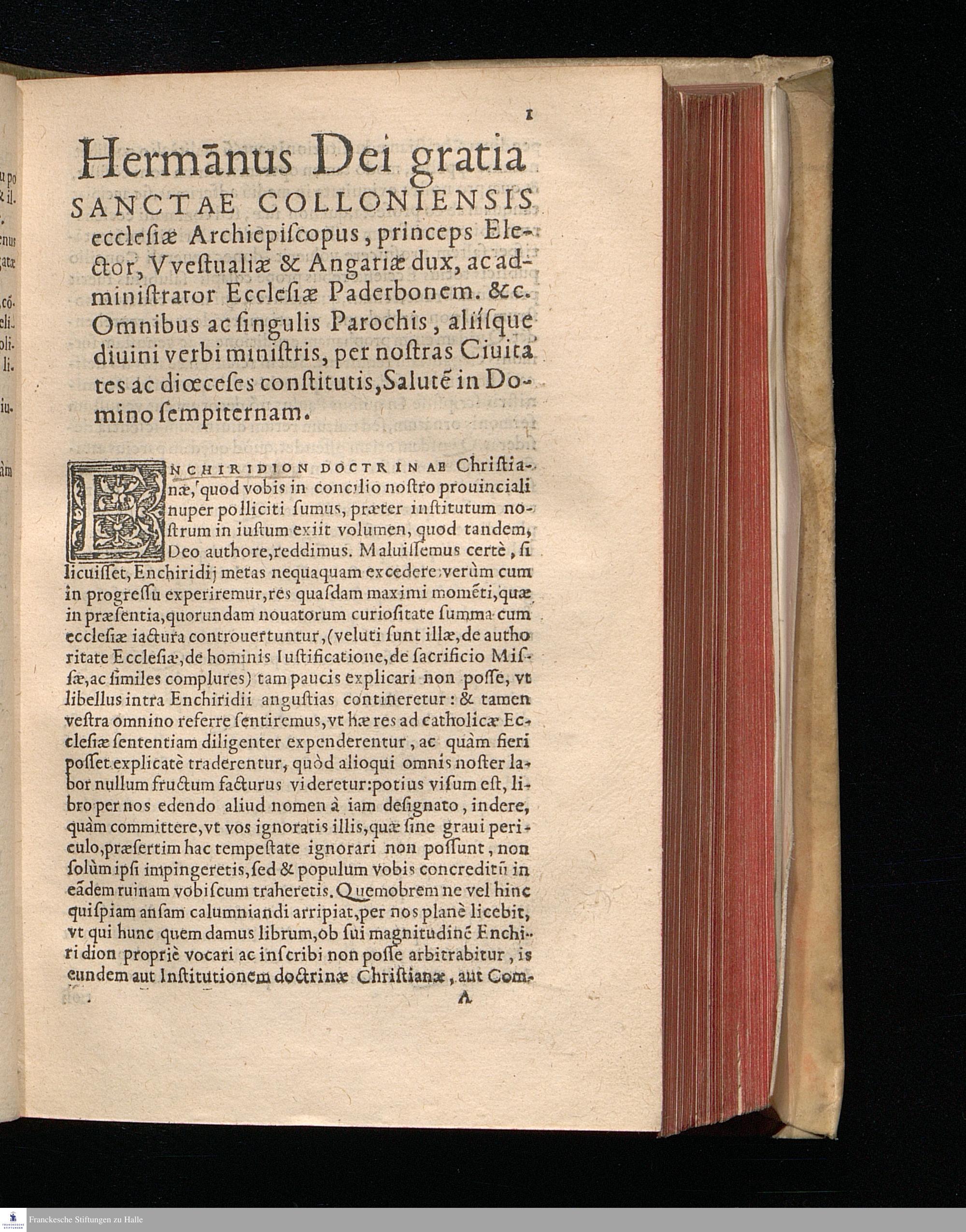 ENCHIRIDION || CHRISTIANAE INSTITV-||tionis in Concilio prouinciali Colo-||niensi editum, opus omnibus ve-||ræ pietatis cultoribus lon-||ge vtilissimum. || Quæ hoc volumine, in quatuor partes distribu-||to, contineantur, sequens pagina indicabit. || Hanc nostram editionem, candide lector, locis || multis castigatiore[m] tibi exhibere studuimus, || consultis (vbi referre visum est) cùm Germa-||nico tum Venetiano exemplaribus. ||