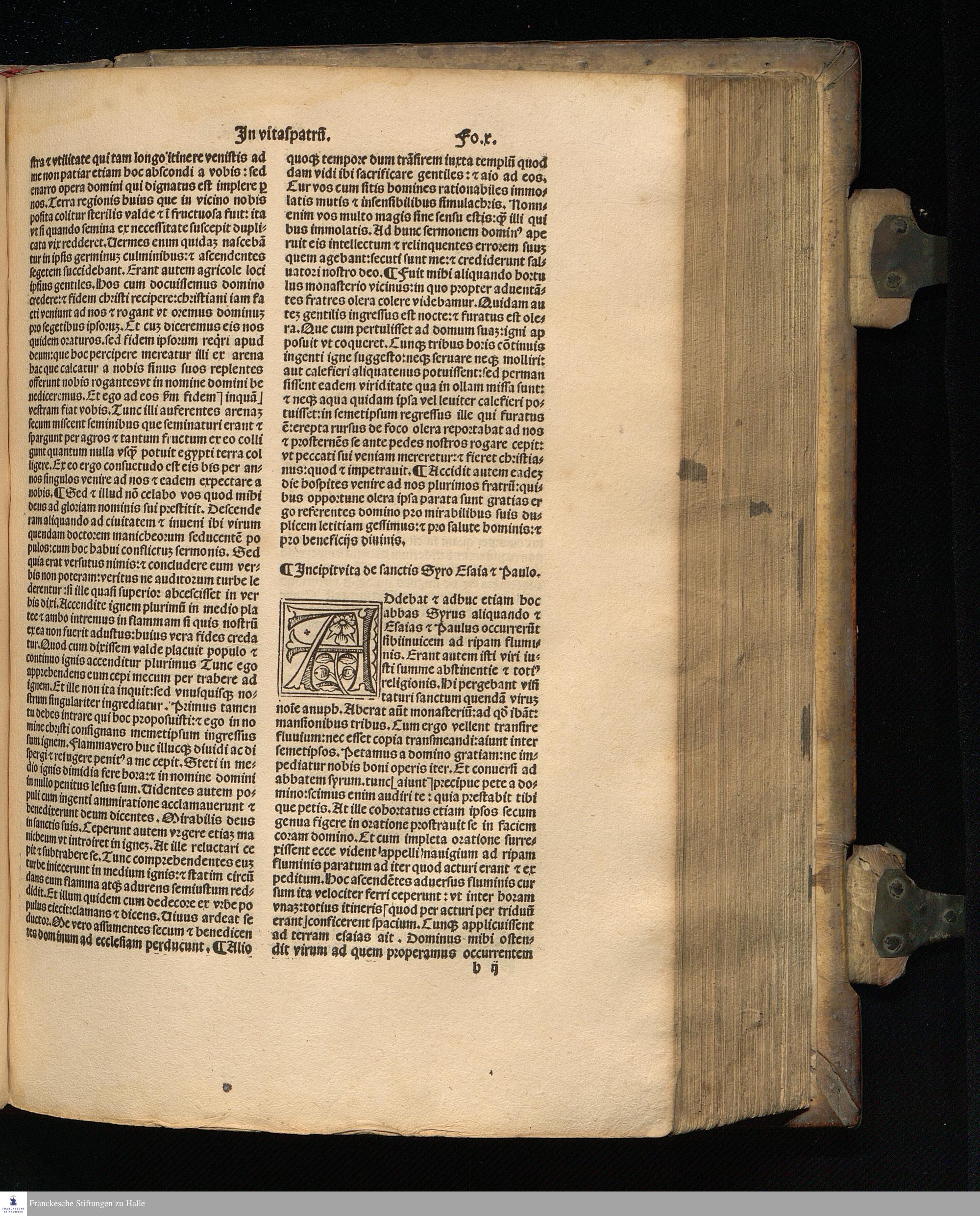 Incipit prologus sancti Hieronymi Cardinalis presbytri in libros Vitaspatrum sanctorum Egyptiorum: etiam corum qui in Scitbia Thebaida atque Mesopotamia morati sunt: non solum quos oculis vidit: maximoque labore conspexit: verum et qui plura a fide dignis relata conscripsit no tabili diligentia. Denique aliorum etiam autenticorum libellos fideliter e greco in latinum transtulit: et ab alijs translate pro sui perfectione buic operi inseruit.