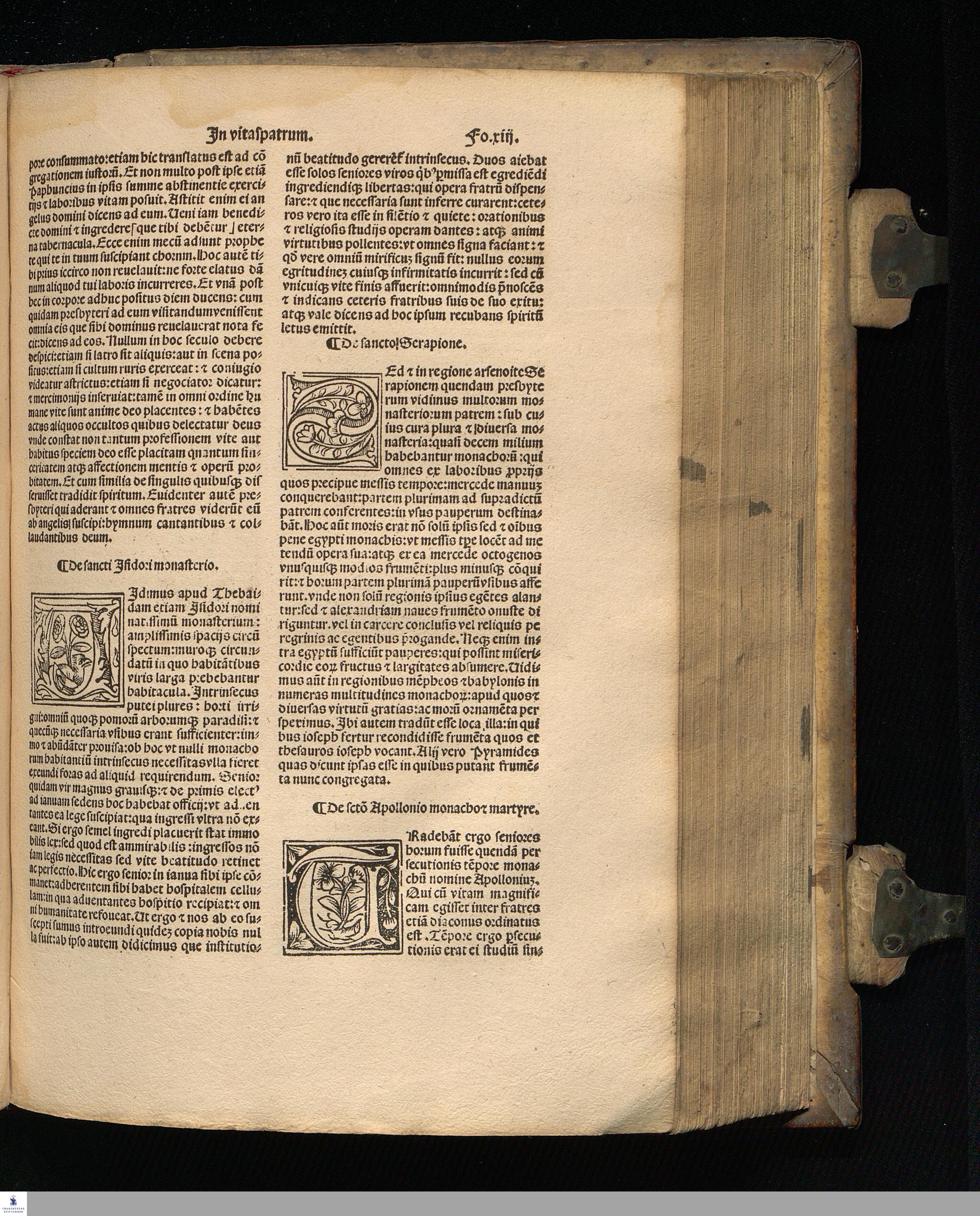 Incipit prologus sancti Hieronymi Cardinalis presbytri in libros Vitaspatrum sanctorum Egyptiorum: etiam corum qui in Scitbia Thebaida atque Mesopotamia morati sunt: non solum quos oculis vidit: maximoque labore conspexit: verum et qui plura a fide dignis relata conscripsit no tabili diligentia. Denique aliorum etiam autenticorum libellos fideliter e greco in latinum transtulit: et ab alijs translate pro sui perfectione buic operi inseruit.