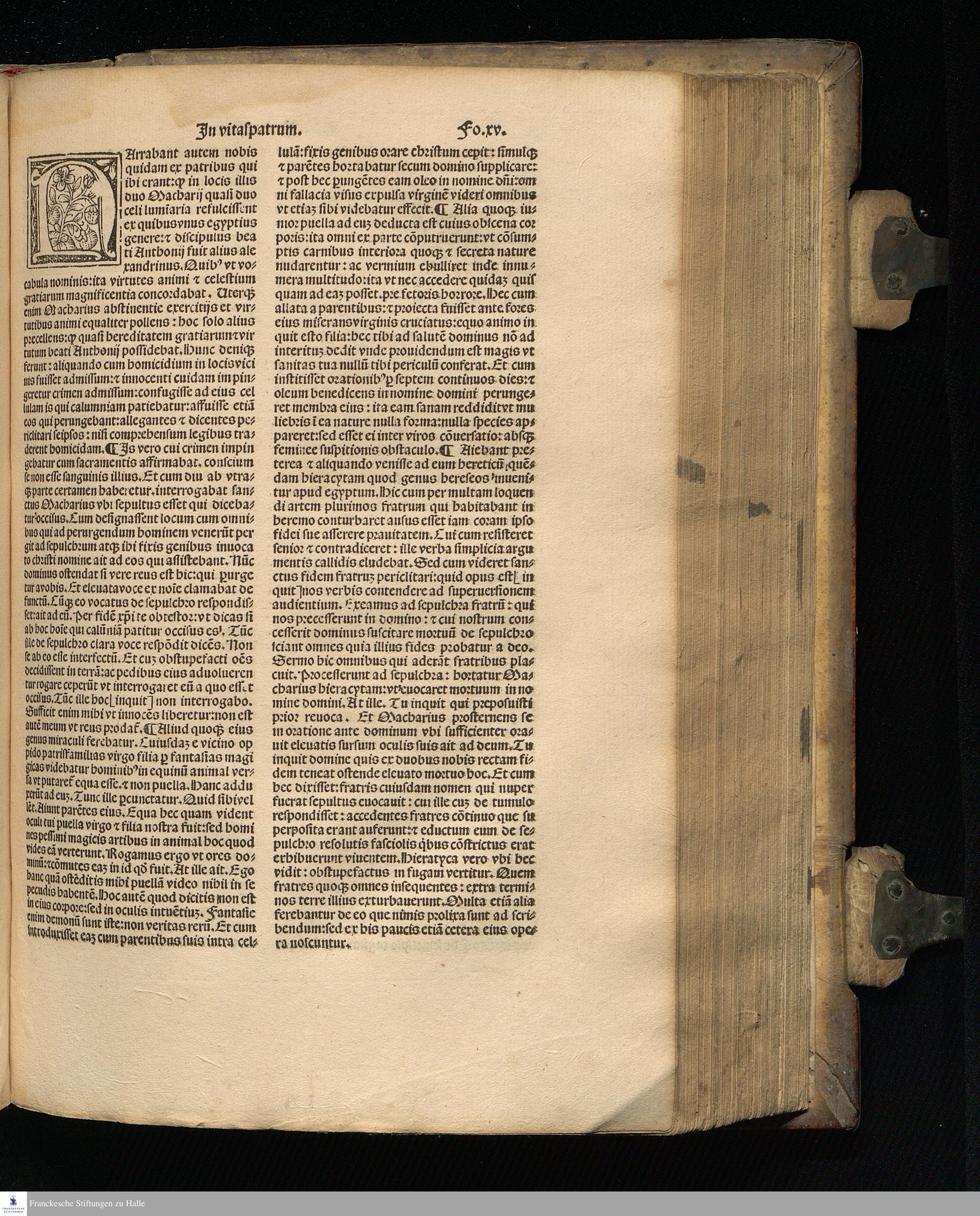 Incipit prologus sancti Hieronymi Cardinalis presbytri in libros Vitaspatrum sanctorum Egyptiorum: etiam corum qui in Scitbia Thebaida atque Mesopotamia morati sunt: non solum quos oculis vidit: maximoque labore conspexit: verum et qui plura a fide dignis relata conscripsit no tabili diligentia. Denique aliorum etiam autenticorum libellos fideliter e greco in latinum transtulit: et ab alijs translate pro sui perfectione buic operi inseruit.