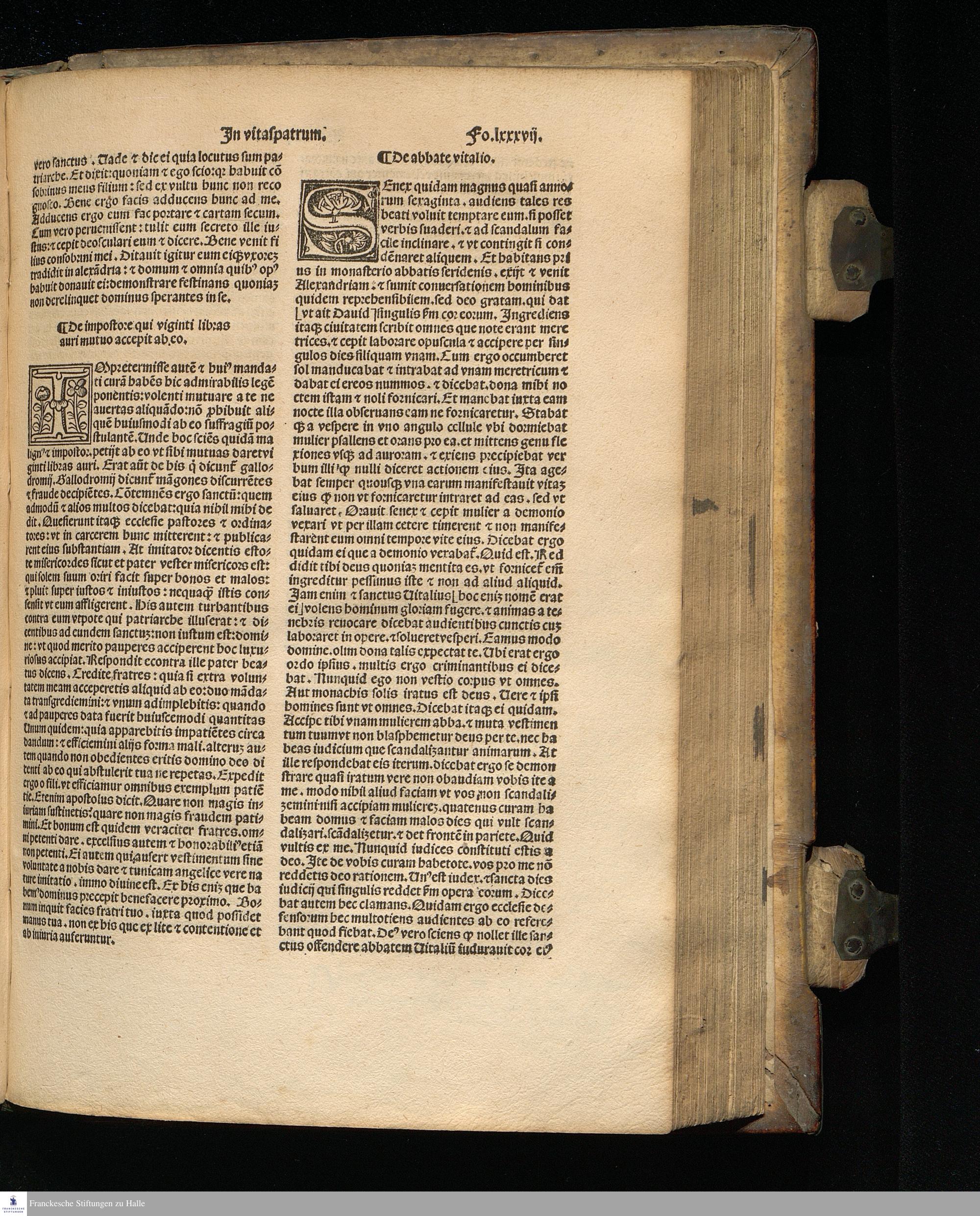 Incipit prologus sancti Hieronymi Cardinalis presbytri in libros Vitaspatrum sanctorum Egyptiorum: etiam corum qui in Scitbia Thebaida atque Mesopotamia morati sunt: non solum quos oculis vidit: maximoque labore conspexit: verum et qui plura a fide dignis relata conscripsit no tabili diligentia. Denique aliorum etiam autenticorum libellos fideliter e greco in latinum transtulit: et ab alijs translate pro sui perfectione buic operi inseruit.
