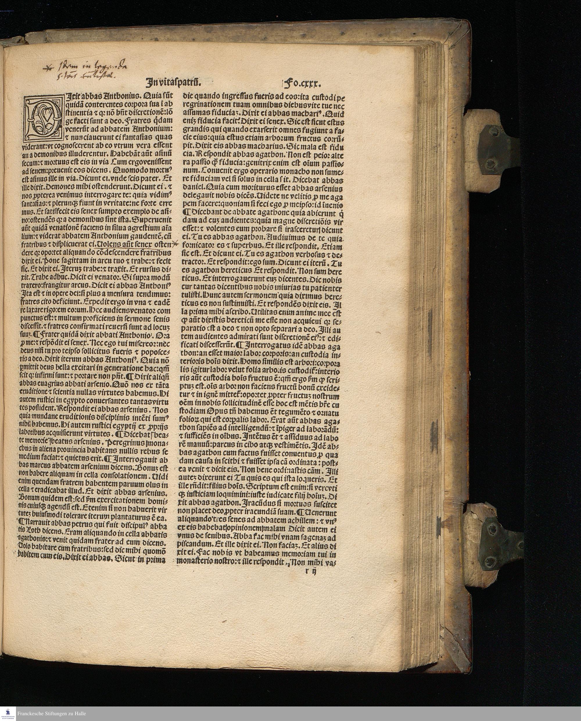 Incipit prologus sancti Hieronymi Cardinalis presbytri in libros Vitaspatrum sanctorum Egyptiorum: etiam corum qui in Scitbia Thebaida atque Mesopotamia morati sunt: non solum quos oculis vidit: maximoque labore conspexit: verum et qui plura a fide dignis relata conscripsit no tabili diligentia. Denique aliorum etiam autenticorum libellos fideliter e greco in latinum transtulit: et ab alijs translate pro sui perfectione buic operi inseruit.