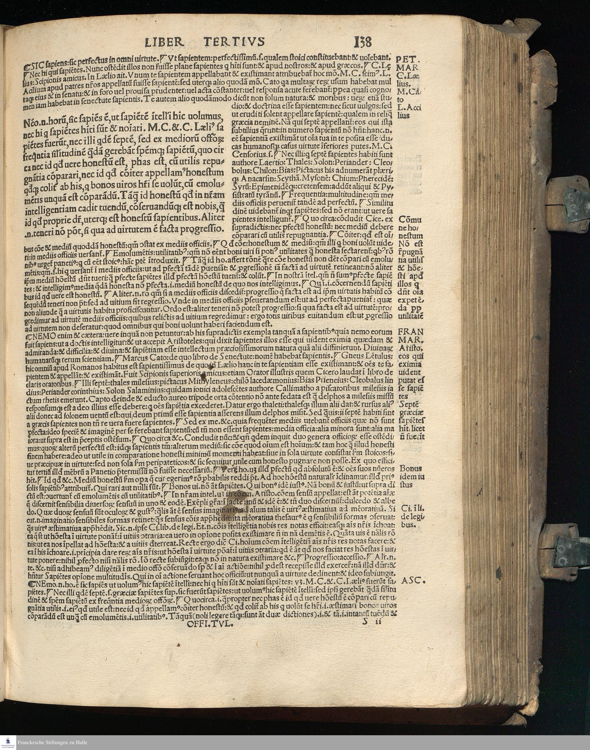 TVLLIVS DE || Officijs: de amicitia: de senectute: nec || non Paradoxa eiusdem: opus Bene||dicti Brugnoli studio emaculatum || additis graecis quae deerant || cum Interpraetatione super || officijs Petri Marsi Francisci Matu||rantij necnon Jodoci Badij Ascensij. || In amicitia vero Omni || boni eiusdemq[ue] || Ascensij: Martini Phi=||letici [et] Ascensij in Senectute. Adiun=||ctis praeterea com[m]entarijs eiusdem || Francisci: Omniboni: Ascensijq[ue] || in vltimum paradoxon || Quod latinorum nullius ad haec vsq[ue] || te[m]pora ausus est enucleare. ... || Cum Gratia [et] Priuilegio.