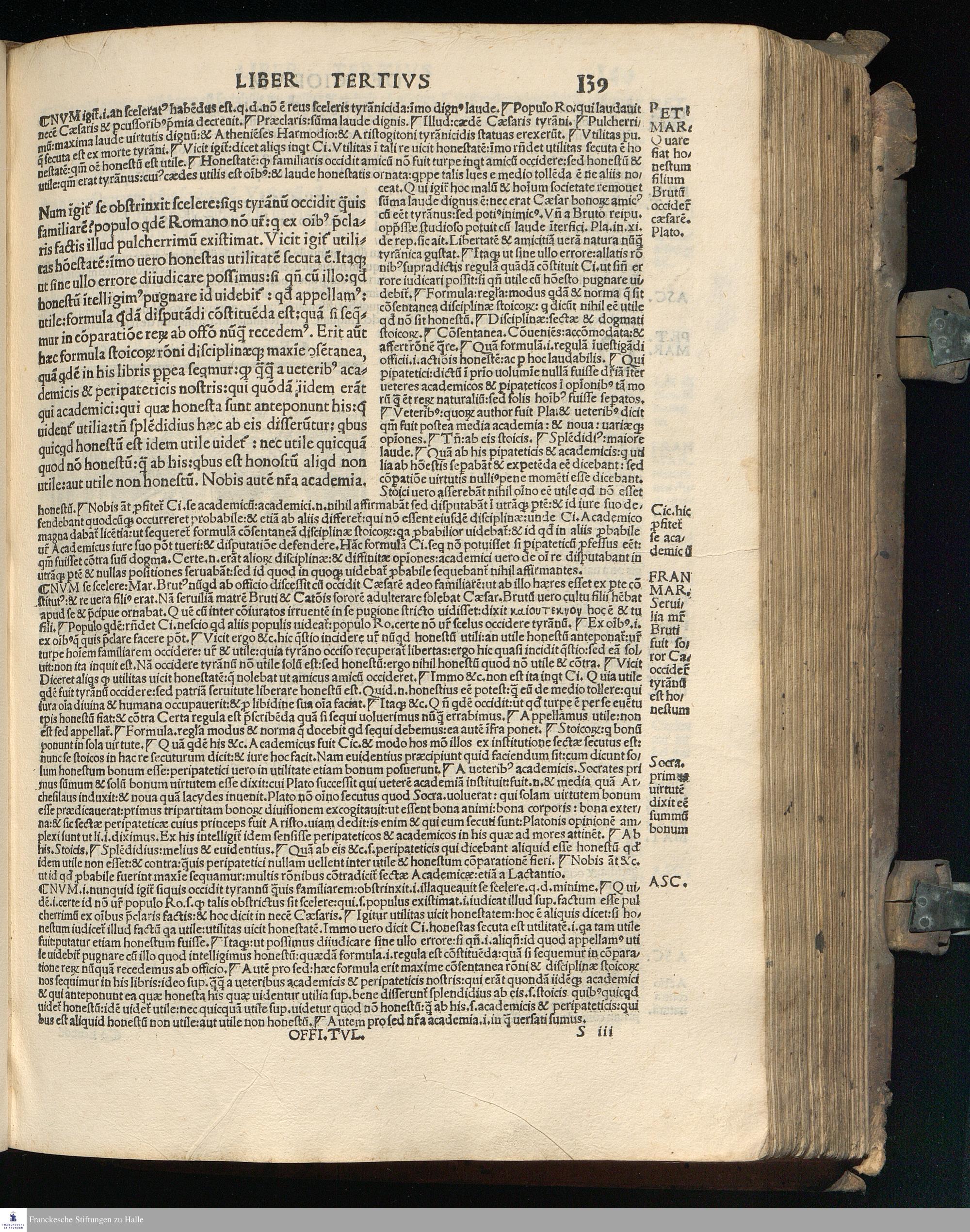 TVLLIVS DE || Officijs: de amicitia: de senectute: nec || non Paradoxa eiusdem: opus Bene||dicti Brugnoli studio emaculatum || additis graecis quae deerant || cum Interpraetatione super || officijs Petri Marsi Francisci Matu||rantij necnon Jodoci Badij Ascensij. || In amicitia vero Omni || boni eiusdemq[ue] || Ascensij: Martini Phi=||letici [et] Ascensij in Senectute. Adiun=||ctis praeterea com[m]entarijs eiusdem || Francisci: Omniboni: Ascensijq[ue] || in vltimum paradoxon || Quod latinorum nullius ad haec vsq[ue] || te[m]pora ausus est enucleare. ... || Cum Gratia [et] Priuilegio.