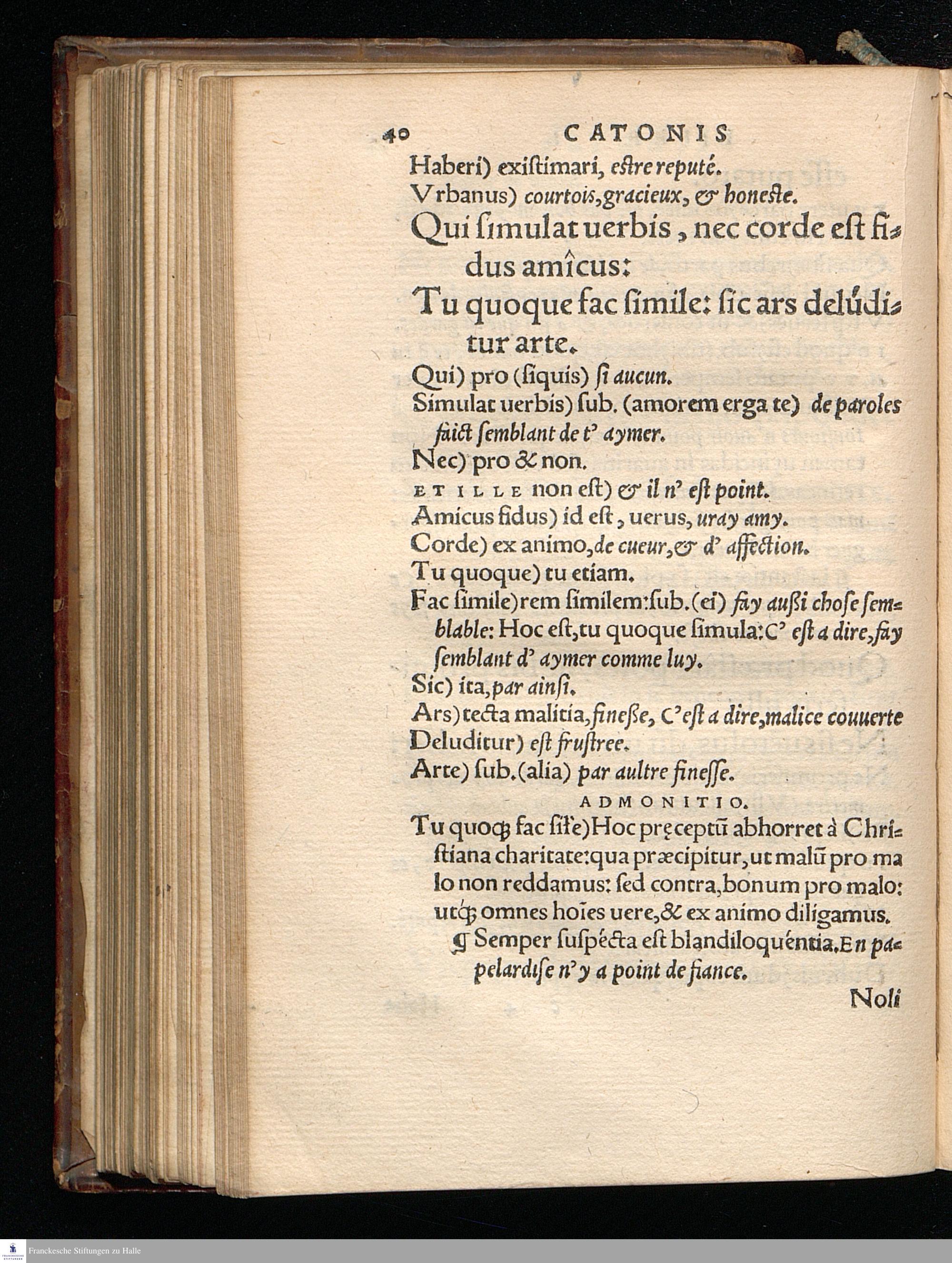 DISTICHA || DE MORIBVS, NO-||MINE CATONIS IN-||scripta, cum Latina & Gallica || interpretatione. || Epítome in síngula ferè dísticha. || Dic̄ta sapientum cum sua quoq[ue] || interpretatione. || Omnia recognita, nonnulla adiecta, || quædam immutata. ||