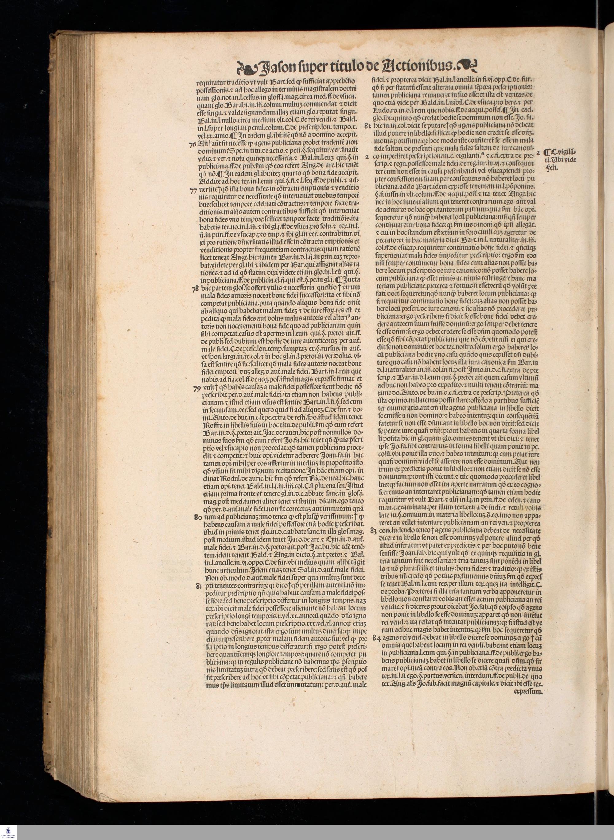 IASON DE ACTIO. || LECTVRA PRECLA-||RISSIMA DO. IASONIS MAY. VIRI || V. I. Doctissimi, super nodoso titulo de Actionibus in Institu=||tionibus Iustinianeis diligenter emendata, pristino[que] nitori || restituta, cum luculentissimis Additionibus non solum || ipsius autoris, uerumetiam celeberrimi uiri Benedi=||cti de Vadis Forosempronie[n]sis, ac etia[m] cum sum=||marijs. D. Baltha. Seuerini nuper adiectis, || Locantur insuper in calce libri huius Termini Actionu[m] omniu[m], cum Ar=||bore elega[n]tissima, luculentissi=||ma[que] eiusdem declaratione, || per utrius[que] iuris docto=||rem eximium Ioan=||nem Crispu[m] de || Montibus, || ciuem || Aquilanum ad || communem iuri stu=||dentium utilitatem collecti.