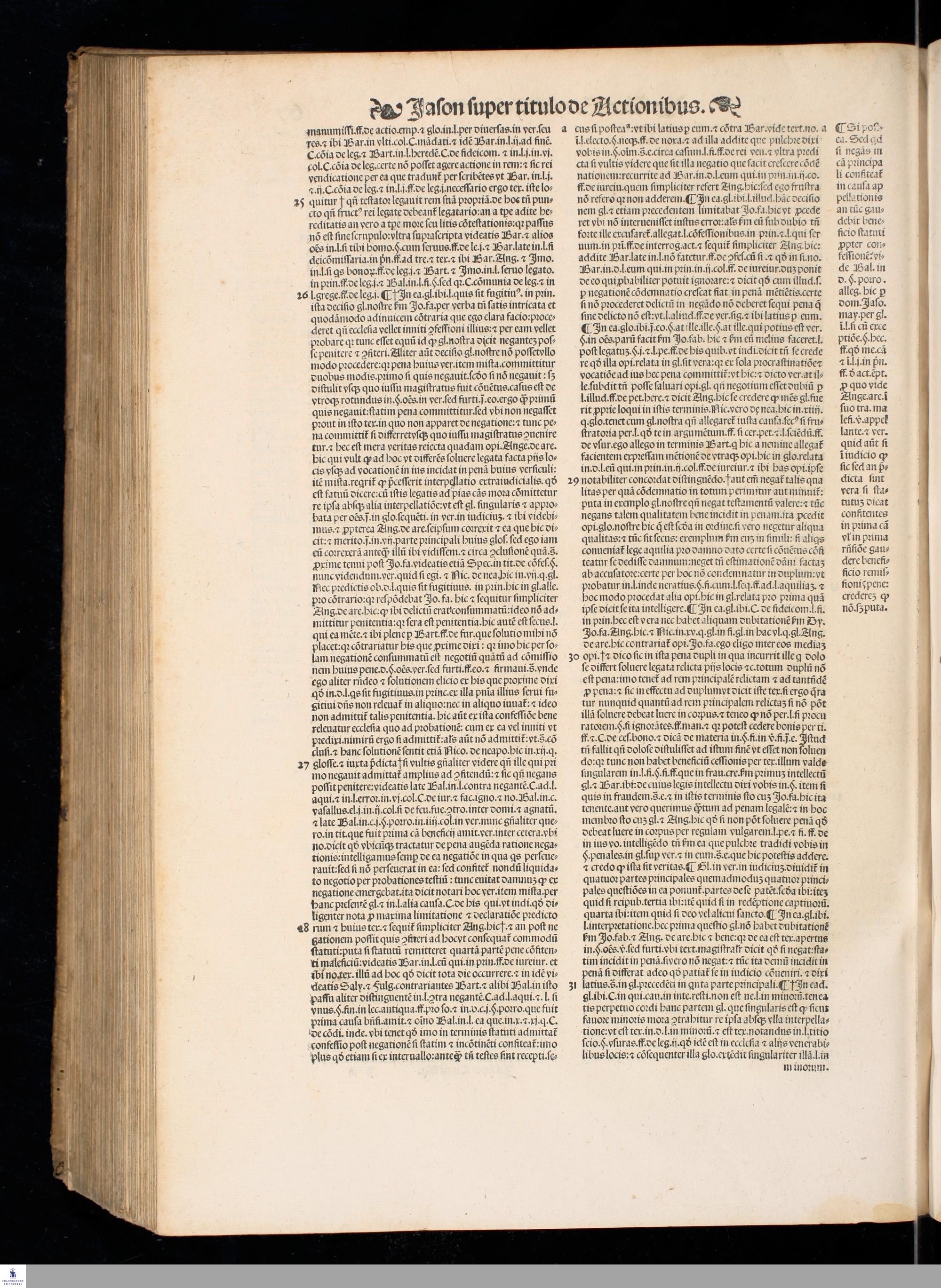 IASON DE ACTIO. || LECTVRA PRECLA-||RISSIMA DO. IASONIS MAY. VIRI || V. I. Doctissimi, super nodoso titulo de Actionibus in Institu=||tionibus Iustinianeis diligenter emendata, pristino[que] nitori || restituta, cum luculentissimis Additionibus non solum || ipsius autoris, uerumetiam celeberrimi uiri Benedi=||cti de Vadis Forosempronie[n]sis, ac etia[m] cum sum=||marijs. D. Baltha. Seuerini nuper adiectis, || Locantur insuper in calce libri huius Termini Actionu[m] omniu[m], cum Ar=||bore elega[n]tissima, luculentissi=||ma[que] eiusdem declaratione, || per utrius[que] iuris docto=||rem eximium Ioan=||nem Crispu[m] de || Montibus, || ciuem || Aquilanum ad || communem iuri stu=||dentium utilitatem collecti.