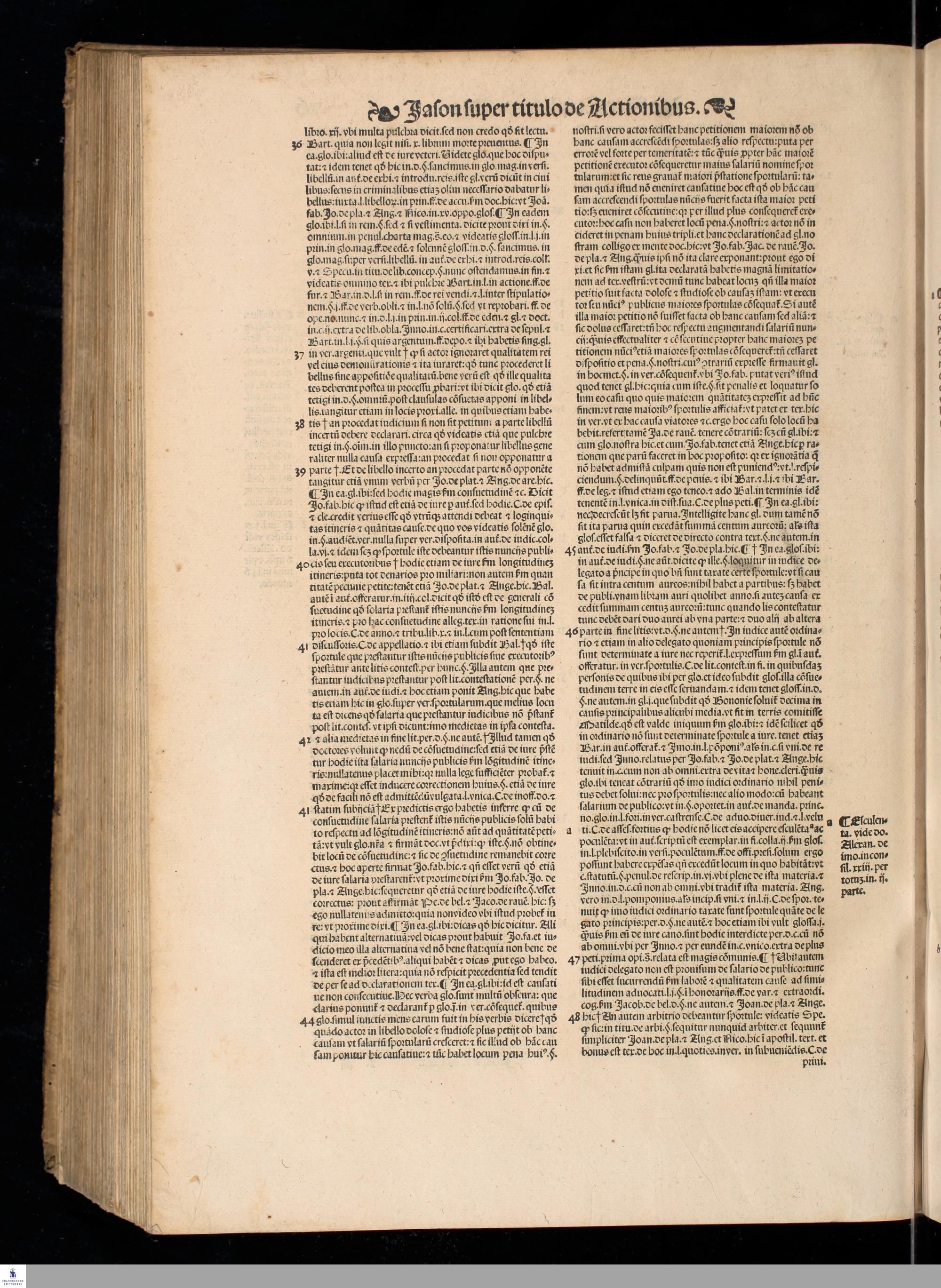 IASON DE ACTIO. || LECTVRA PRECLA-||RISSIMA DO. IASONIS MAY. VIRI || V. I. Doctissimi, super nodoso titulo de Actionibus in Institu=||tionibus Iustinianeis diligenter emendata, pristino[que] nitori || restituta, cum luculentissimis Additionibus non solum || ipsius autoris, uerumetiam celeberrimi uiri Benedi=||cti de Vadis Forosempronie[n]sis, ac etia[m] cum sum=||marijs. D. Baltha. Seuerini nuper adiectis, || Locantur insuper in calce libri huius Termini Actionu[m] omniu[m], cum Ar=||bore elega[n]tissima, luculentissi=||ma[que] eiusdem declaratione, || per utrius[que] iuris docto=||rem eximium Ioan=||nem Crispu[m] de || Montibus, || ciuem || Aquilanum ad || communem iuri stu=||dentium utilitatem collecti.
