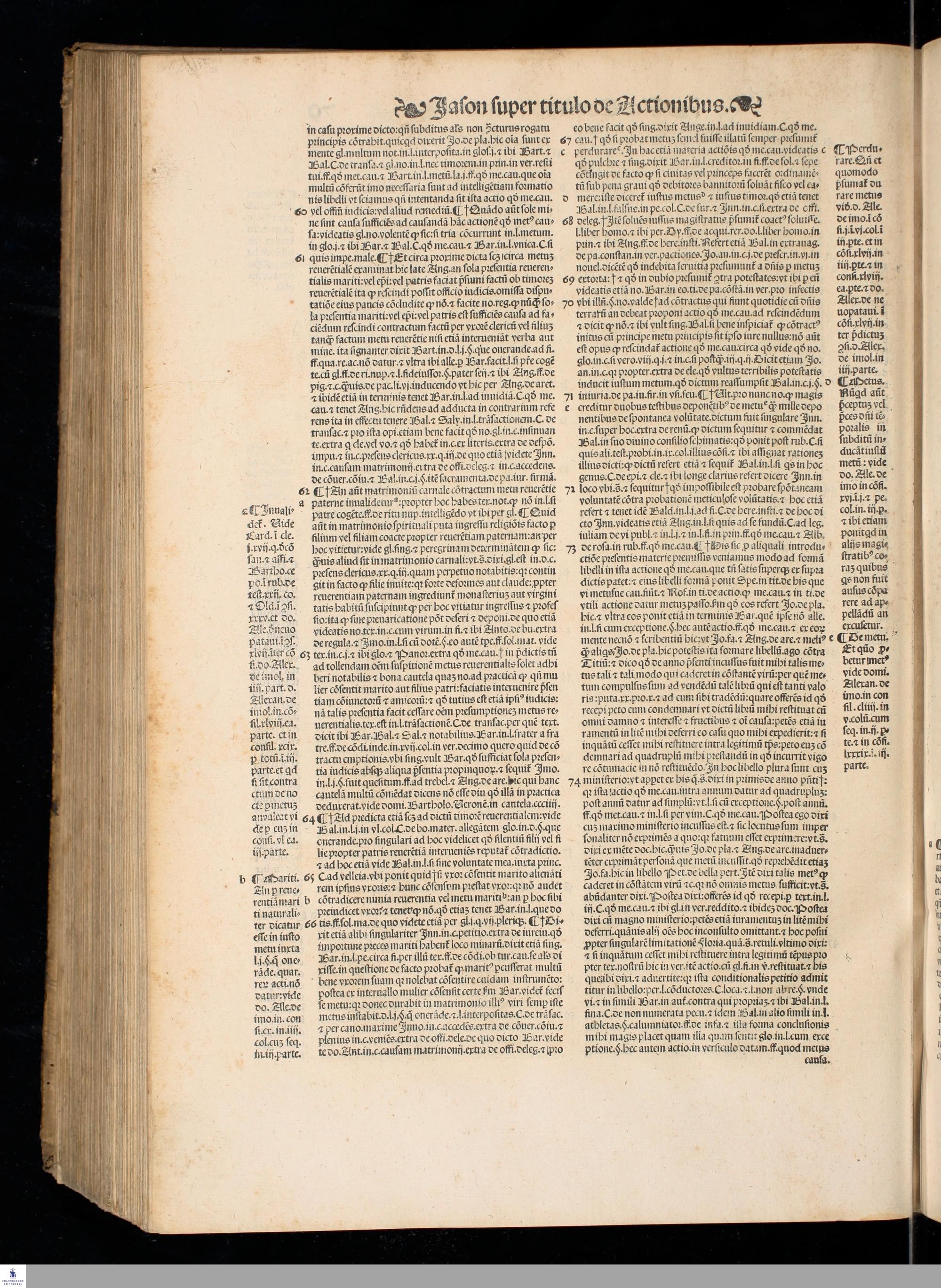 IASON DE ACTIO. || LECTVRA PRECLA-||RISSIMA DO. IASONIS MAY. VIRI || V. I. Doctissimi, super nodoso titulo de Actionibus in Institu=||tionibus Iustinianeis diligenter emendata, pristino[que] nitori || restituta, cum luculentissimis Additionibus non solum || ipsius autoris, uerumetiam celeberrimi uiri Benedi=||cti de Vadis Forosempronie[n]sis, ac etia[m] cum sum=||marijs. D. Baltha. Seuerini nuper adiectis, || Locantur insuper in calce libri huius Termini Actionu[m] omniu[m], cum Ar=||bore elega[n]tissima, luculentissi=||ma[que] eiusdem declaratione, || per utrius[que] iuris docto=||rem eximium Ioan=||nem Crispu[m] de || Montibus, || ciuem || Aquilanum ad || communem iuri stu=||dentium utilitatem collecti.