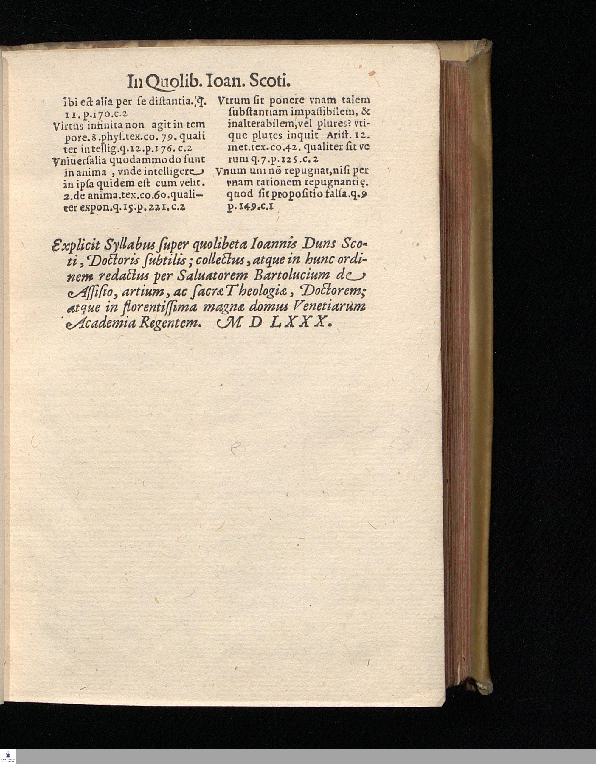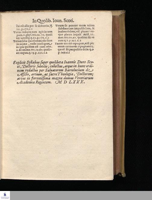 F. IOAN. DVNS || SCOTI, || ORDINIS MINORVM, || THEOLOGORVM OMNIVM || EMINENTISSIMI, || Atque Academiæ subtilium Antesignani, || Quæstiones Quolibetales ex quatuor Voluminibus || scripti Oxoniensis Super Sententias. || A R. P. SALVATORE BARTOLVCIO || de Assisio, eiusdem instituti, artium, & sacræ Theologiæ Do-||ctore, doctrinæq[ue] Scoticæ dilucidatore, fidelissime recognitæ, col-||lationeq[ue] multorum exemplarium, summo labore emendatio-||res, correctioresq. nunc redditæ; Nec non variarum lectionum, || atque observationum dote locupletatæ, ornatæ, & illustratæ. || Cum compendio Quolibetorum, & Syllabo rerum memorabilium. ||