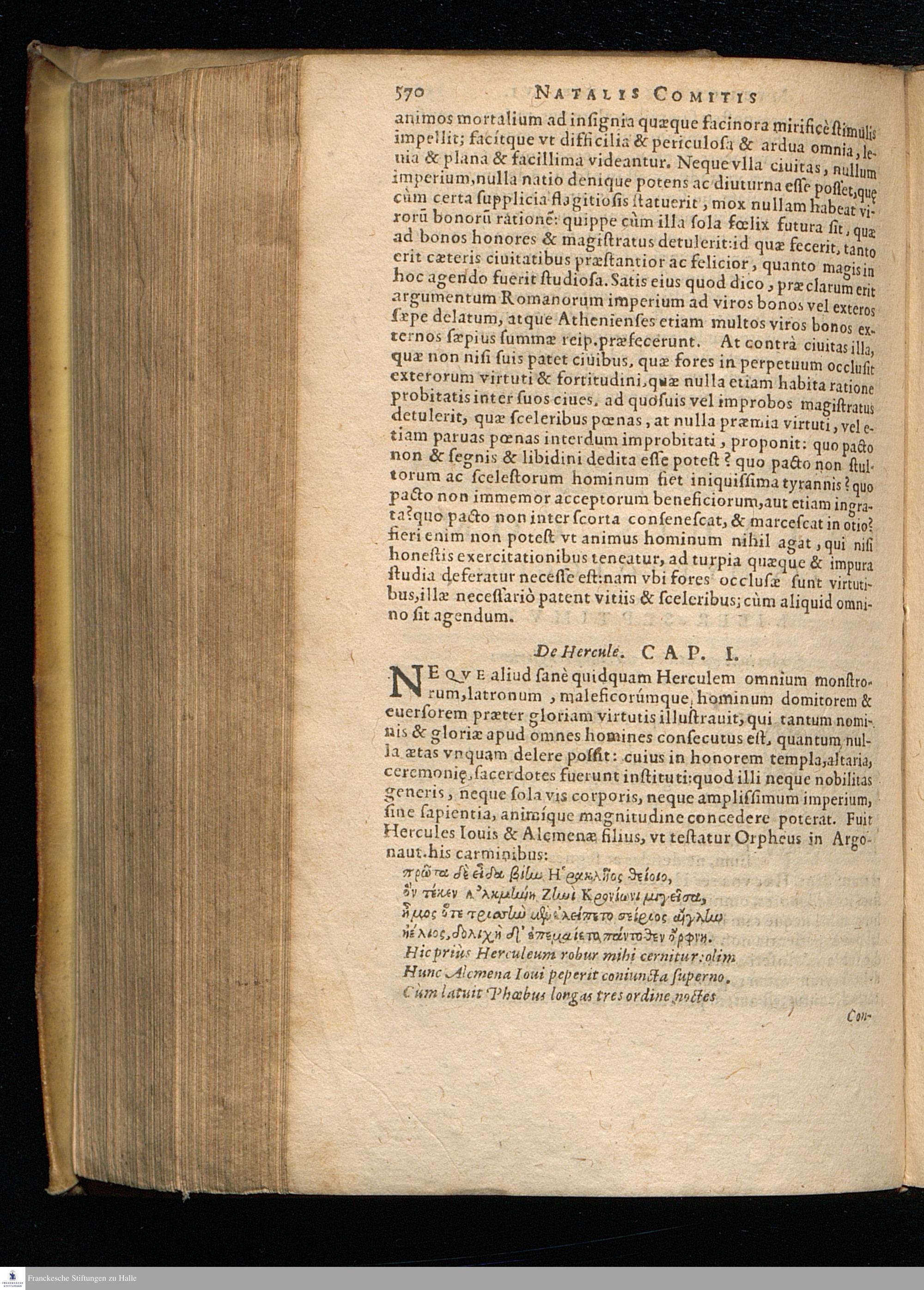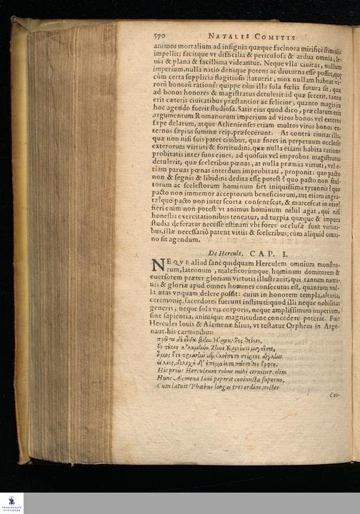NATALIS CO-||MITIS MYTHOLO-||GIÆ, SIVE EXPLICA-||TIONIS FABVLARVM, || Libri decem: || In quibus omnia propè Naturalis & Moralis Philosophiæ || dogmata contenta fuisse demonstratur. || Nuper ab ipso autore recogniti & locupletati. || EIVSDEM LIBRI IIII. DE VENATIONE. || Cum Indice triplici, rerum memorabilium, vrbium & lo-||corum à variis heroibus denominatorum, ac plan-||tarum & animalium singulis Diis || dictatorum. || Opus cuiusuis facultatis studiosis perutile ac propè necessarium. || ACCESSIT G. LINOCERII MVSA-||RVM MYTHOLOGIA, ET ANONYMI || Observationum in totam de Diis Gentium || narrationem Libellus. ||